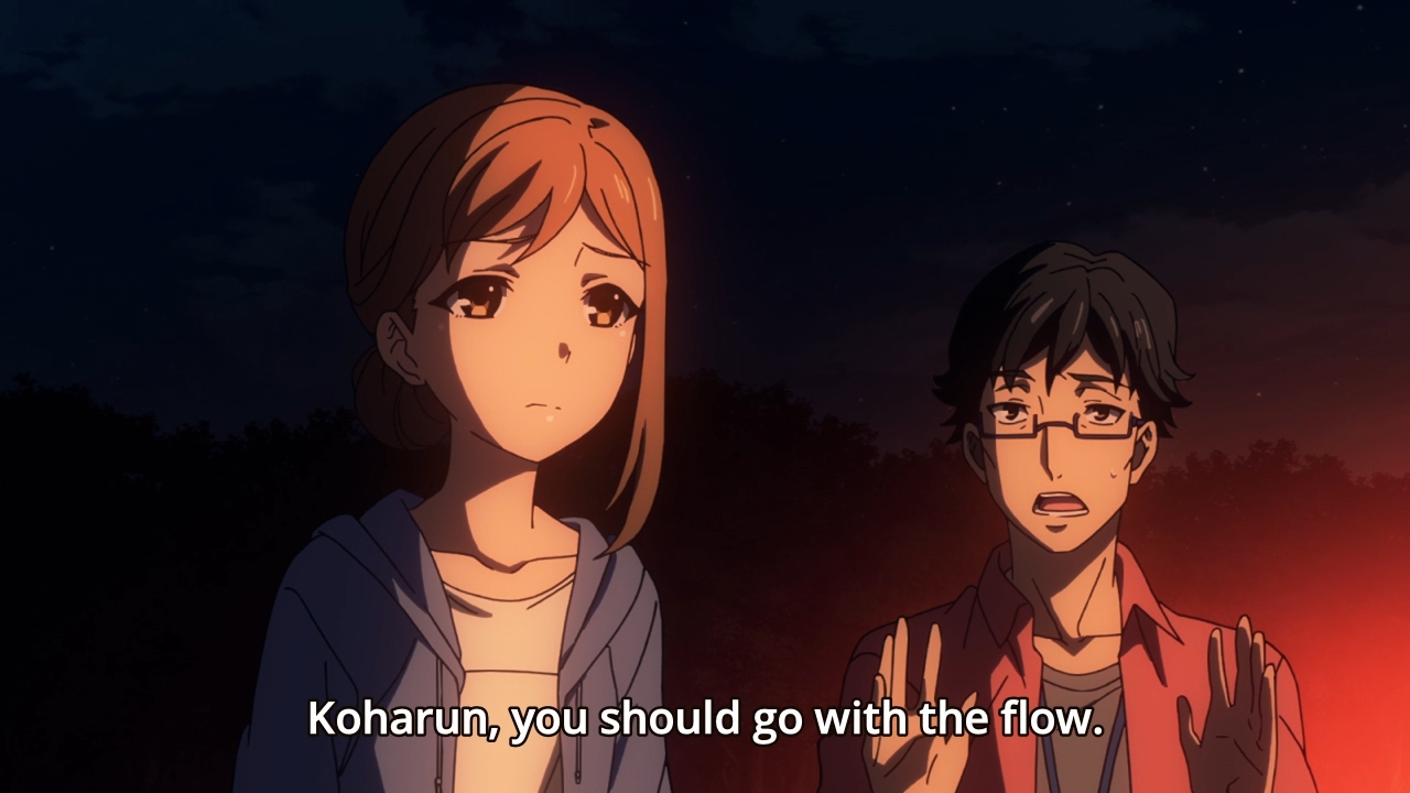 Back to the present, everyone manages to capture Masaki. She had gone through the tunnel earlier, but then she came back? Again, this is just Mayoiga withholding information from the audience to create a sense of mystery and suspense. We’ll find out later who or what she is, so I don’t want to spend too much time speculating about future plot developments. It’s just not very fruitful in my opinion. In any case, the group ties the girl up to wooden post, then proceed to torture her. Nothing seems to provide any credence to the idea that Masaki is a ghost, but the mob is too far gone. They want blood, and sure enough, that is what they get when Speedstar lightly cuts her arm with a knife. Oddly enough, it’s Speedster who has now gone off the deep end. He hasn’t been chased by any bizarre apparition yet. Rather, he’s fixated on the idea that his buddy needs him and can’t live without him. Perhaps Speedstar’s deepest fear is that he’ll no longer be able to play the role of his friend’s savior. After all, if Masaki had her way, then Mitsumune would be self-sufficient. Speedstar can’t have that, and he’s willing to kill Masaki if necessary. I only wish we had seen more of Speedstar up to this point. It would make his actions here a little less jarring. Then again, most people would unironically argue that being jarring is Mayoiga’s MO. Oh look, we’re almost out of the time. Masaki thus claims that she’ll now reveal the truth to everyone… only for the credits to start rolling. Welp.