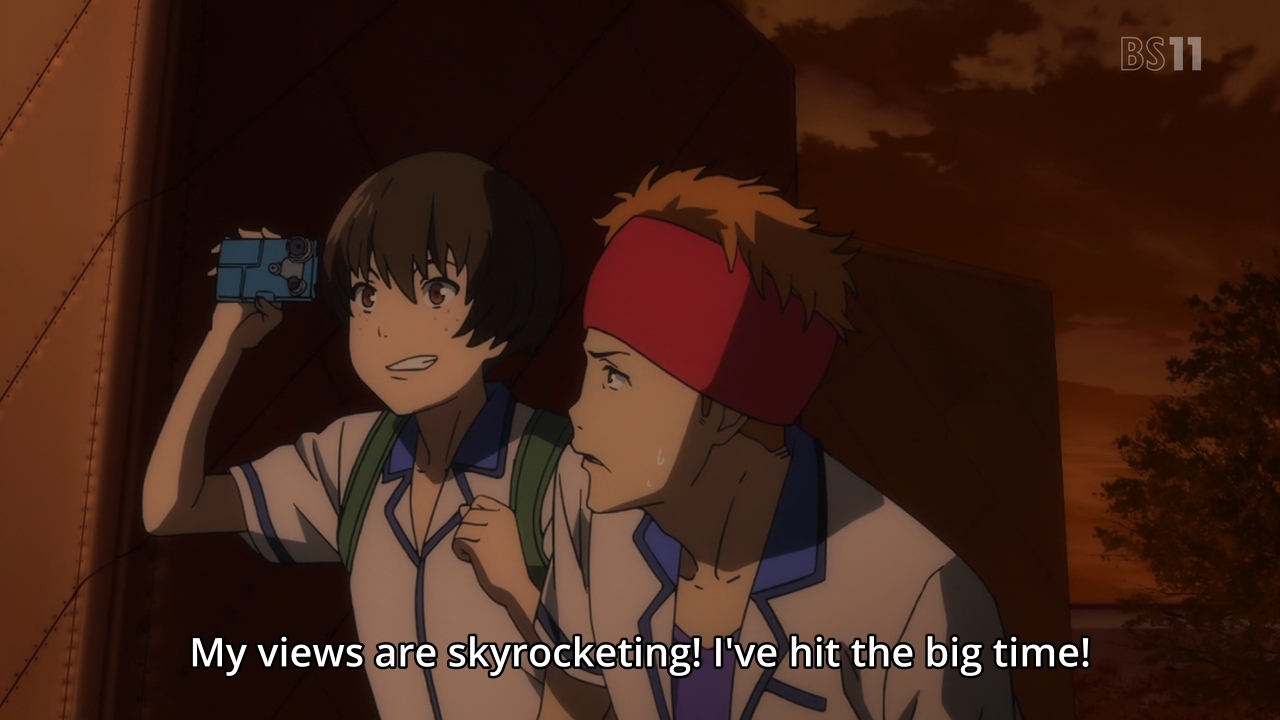 As expected, the action continues to be Kuromukuro’s high mark as I was pretty entertained by the fight between the two mechas. Certainly, I had some quibbles with a few things here and there, but I’ll get to those in a bit. Point is, we were on a high. The animation is great as usual, the battle choreography is solid, the music is on point, and ooh, something’s coming out of the Yellow Crab! We’re finally going to learn a thing or two about the enemy! Aaaaand… it’s some normal-looking human with green hair. Okay, okay, before anyone takes me too seriously here, I’m just joking around a bit. A tiny bit. The fact that our enemy is a plain-looking human doesn’t really matter all that much in the long run. I only bring it up, because it was a funny moment in the episode. Thanks to Kayo’s livestreaming of the event, the world is watching. The whole world is waiting with bated breath to see our “uchuujin.” Then it just turns out to be some dude in a rather uninspired outfit.