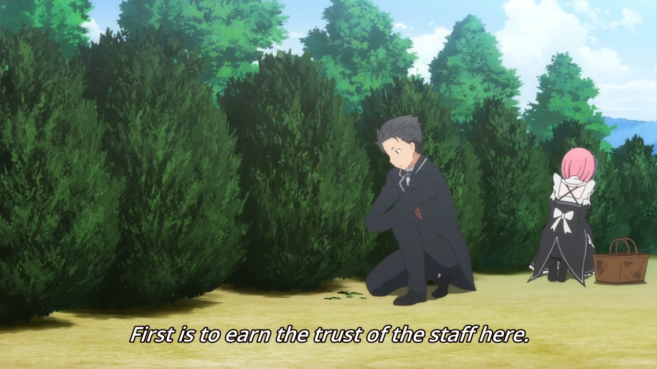 — At one point, Subaru nearly fucks up when he breaks a vase, and immediately goes to find a replacement. Rem is suspicious. Subaru tries to write it off by claiming that her sister had told him beforehand. Considering how close the two sisters are, I doubt Rem would buy it… but nothing comes of this scene. Nada. We just go right back to slice-of-life bullshit as if our life depends on it. Maybe the repercussions will rear their ugly heads in next week’s episode, but for now, I expected nothing and Re:Zero still manages to disappoint me.