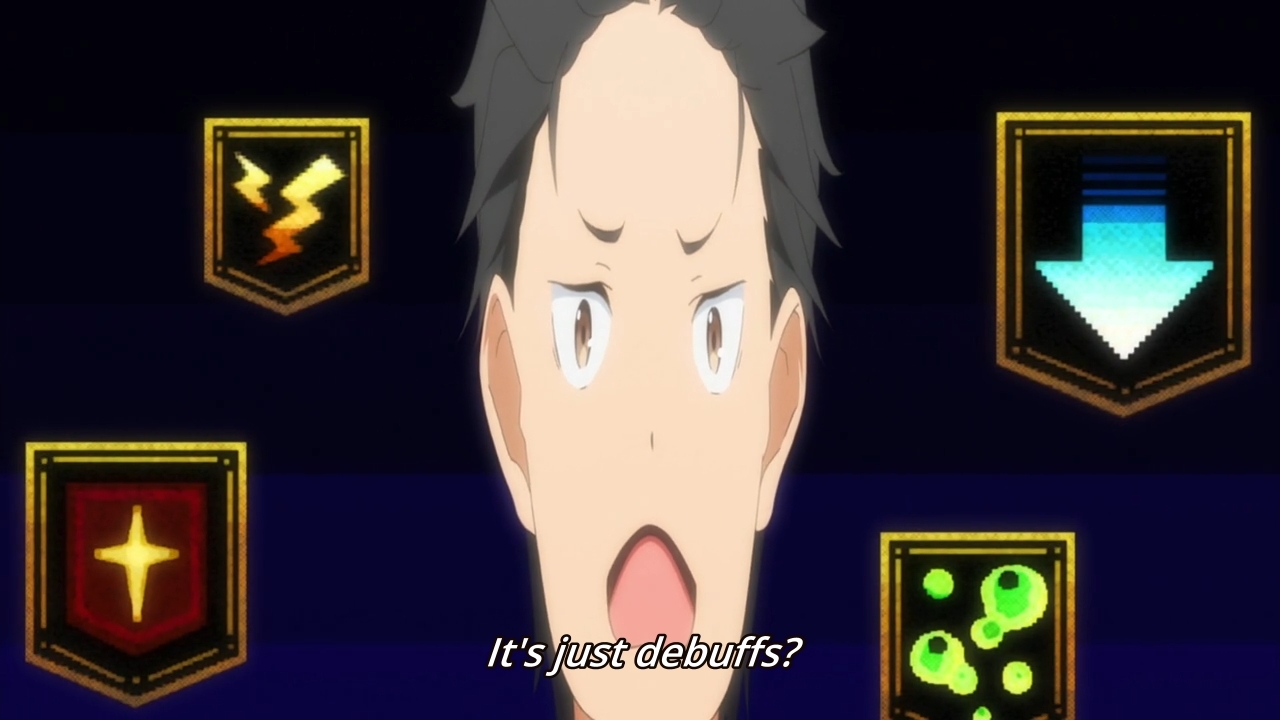 — As it turns out, Subaru’s attribute is Shadow, a class of spells that mostly contains debuffs. From my experience, debuffs in RPGs are either incredibly overpowered or incredibly useless. Anyway, as much as I loathe this sleep-inducing talk about mana and gates and whatnot, I suspect this magic talk will be very helpful in later episodes to come. Just not this one! Patience, little one! We still have plenty of slice-of-life chicanery to get through!