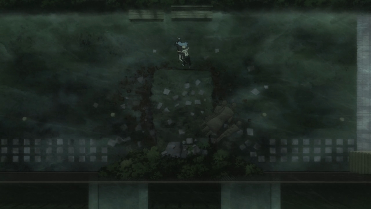 — Last and very least, we have Chidori and Katsuhira. I don’t know why Chidori even tries. She starts confessing, but all of a sudden, Katsuhira gets a flashback. Or a PTSD episode. Or whatever… point is, he’s not even listening to her. Hell, we’re not even listening to her. This thrilling track starts playing, and he starts recalling memories of him and Noriko, so he throws open the front doors to the school. He sprints out into the midst of the raging storm, and at the same time, Noriko is emerging from a series of convoluted underground tunnels that seem to run throughout Sugumori City. At the exact moment that she emerges, a statue threatens to fall on her. And at the exact moment that it would have fallen on her, Katsuhira flies in out of nowhere and saves her. All I can say is… poor Chidori.