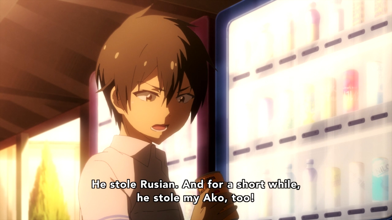 So Nishimura gets his account phished at the worst possible time, and as result, his online waifu ends up having cybersex with some random dude. Nah, the anime would never go there. Instead, the bad guy is too dumb to even fake it. He just outright asks the girl for nudes, so she realizes right away that she isn’t talking to Rusian. Actually, the whole set-up makes no sense. It’s 2016. Why are you guys still typing shit to each other through the in-game chat? What happened to VOIP? Even better, our dorky hero apparently has no other way to message the girl. He has to quickly run to her room, pound on her door, and literally tell her in person that the online Rusian is an imposter. Right.
