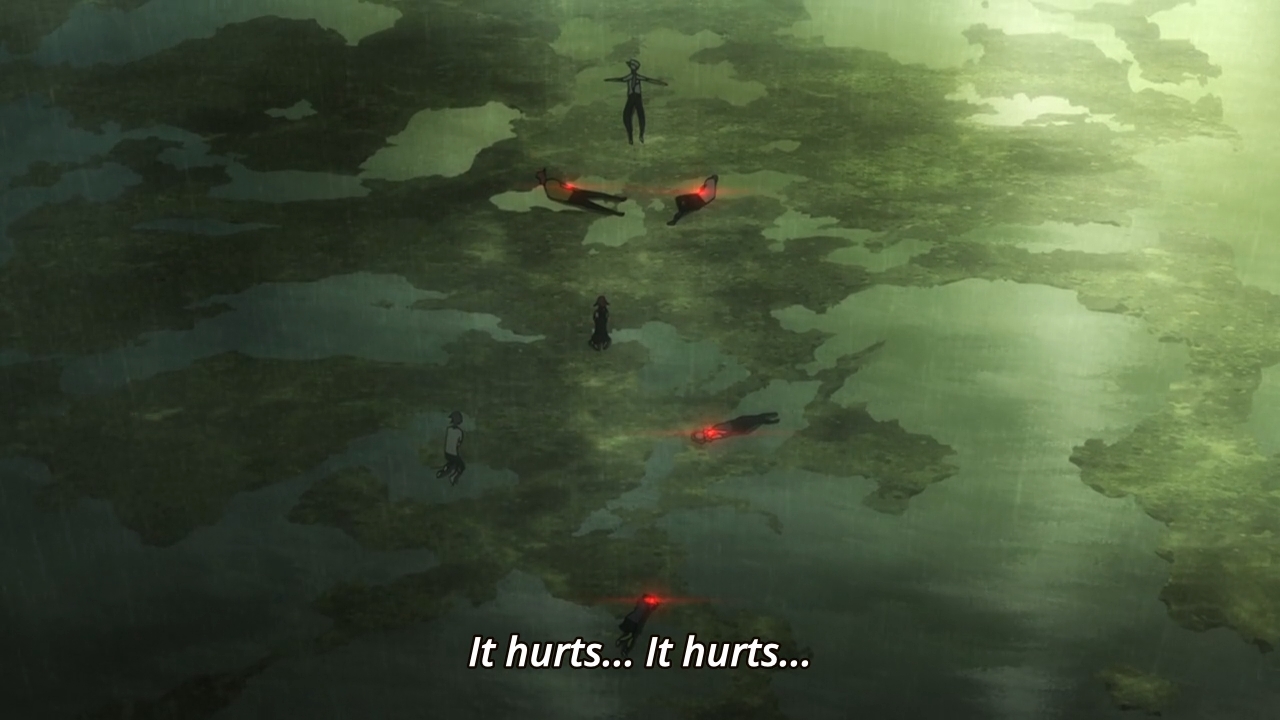 — I’m so distracted by the stuff I wrote above that I can barely discuss the rest of the episode. Um, like before, I’m guessing that Noriko did something (probably tried to commit suicide) in order to give everyone pain, but the pain was so great, it nearly broke those kids. Meanwhile, the incident traumatized Katsuhira so much that he’s repressed his memories. Only by holding her is he able to slowly remember those early days and those kids. Or something like that. If I’ve got something wrong, the Internet never hesitates to correct me anyway.
