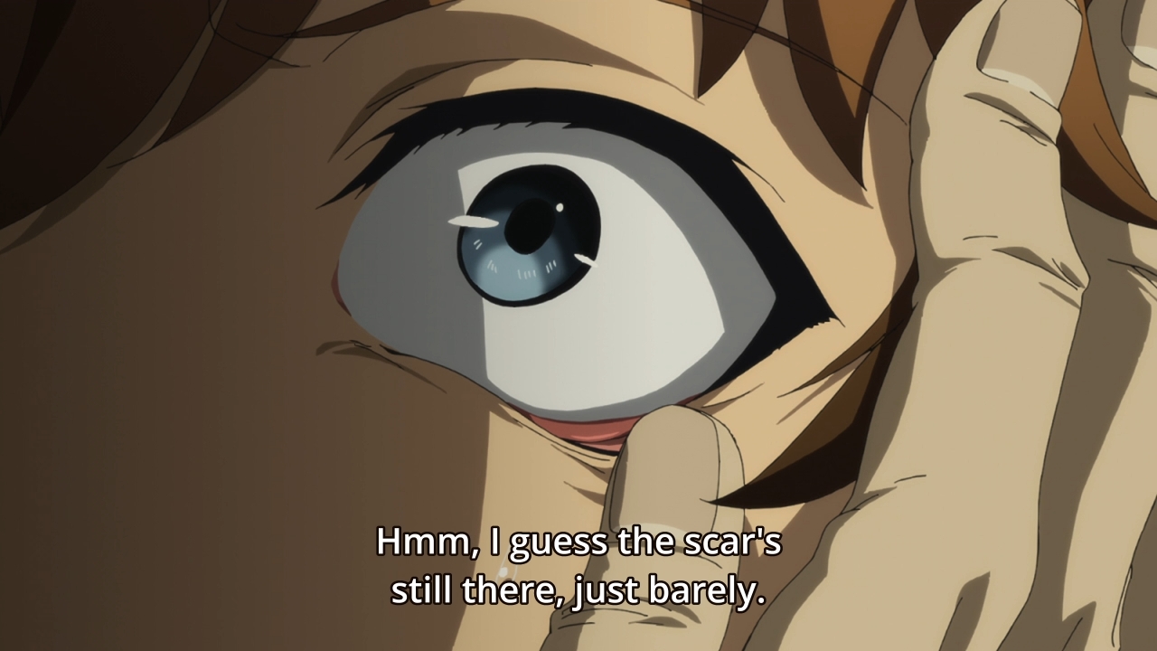 — Ah, you have to embrace your Nanaki like that carving in the rock suggests. But why can’t God both vindicate his research and embrace his psychological scars at the same time? I mean, I don’t really see why he had to end up this way. And what’s with Mitsumune? Has he embraced his Nanaki already? Somehow, God stares into one of Mitsumune’s eyeballs, and can determine that the kid’s psychological scars are still there, but just barely. From his eyeball. Yep.