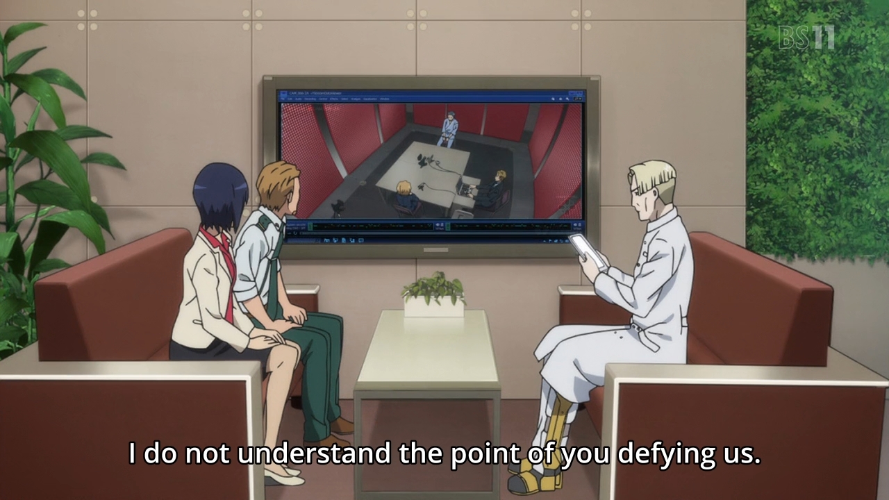 — We then see Akagi expressing his desire to become a GAUS pilot. He’s told by his teacher that he’ll have to go to college, however, to pursue this career. Eh, we kinda already know this won’t be the case. Eventually, we see Akagi get the high score on some mech-based arcade game. We laugh, because we think a video game can’t adequately prepare someone for real-life mecha piloting. But as Akagi leaves, someone else crushes his high score. That someone else is none other than Sophie. Hoo boy. Again, Kuromukuro is just laying the foundation for what’s to come. Nothing too exciting here.