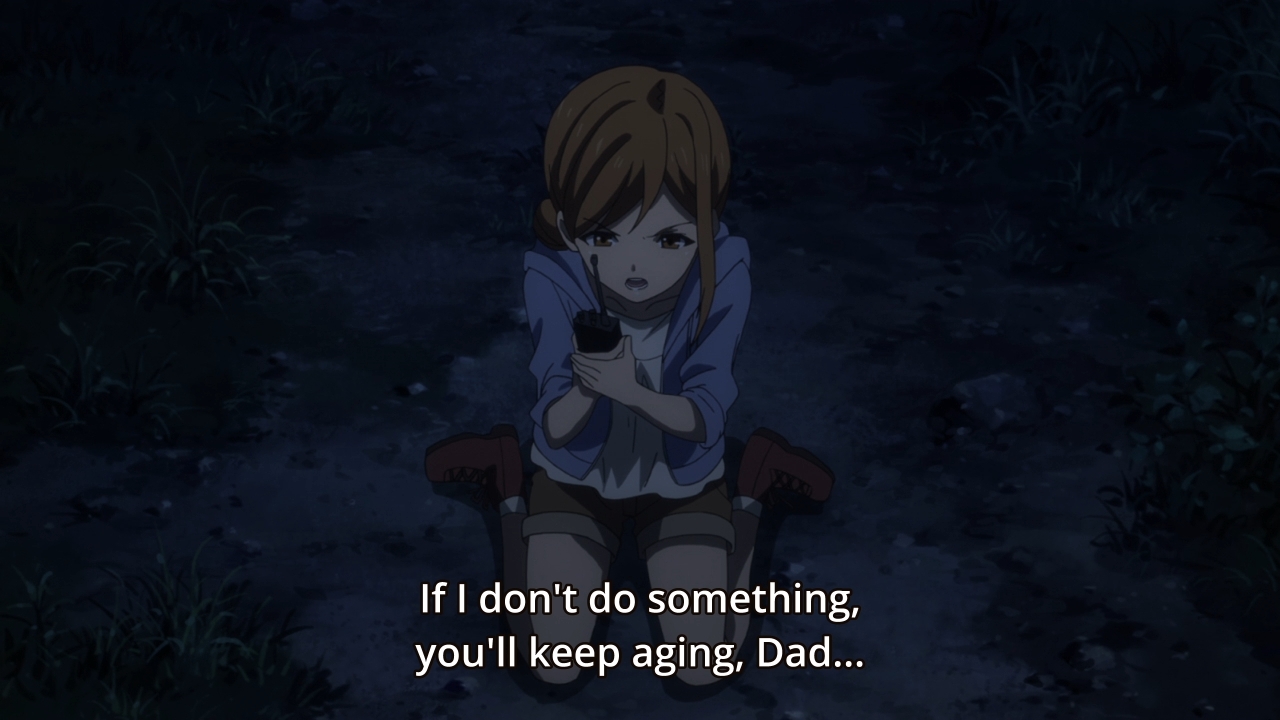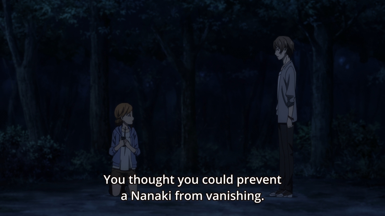 — But what’s this? Mitsumune drops his walkie-talkie, and Koharun hears a familiar voice coming through it… that’s right! Kamiyama is her dad! Explanation time! The best part is when Reiji shows up out of nowhere. Well, he’s a Nanaki so he can probably just teleport from place to place. But more importantly, he starts explaining Koharun’s motives to her. Um, I think she knows why she’s doing the things that she’s doing. But it would be weird for Reiji to just break the fourth wall and start talking to the audience. At the same time, there’s no one else for him to talk to. As a result, he’s speaking directly to Koharun. Isn’t anime just swell? Why is she exploiting people’s traumas? She’s doing this for her dad! If he keeps aging too fast, he’ll die! So if she creates a large enough Nanaki, it might, uh, amplify the other ones, and thus, they can locate her father’s lost Nanaki…?