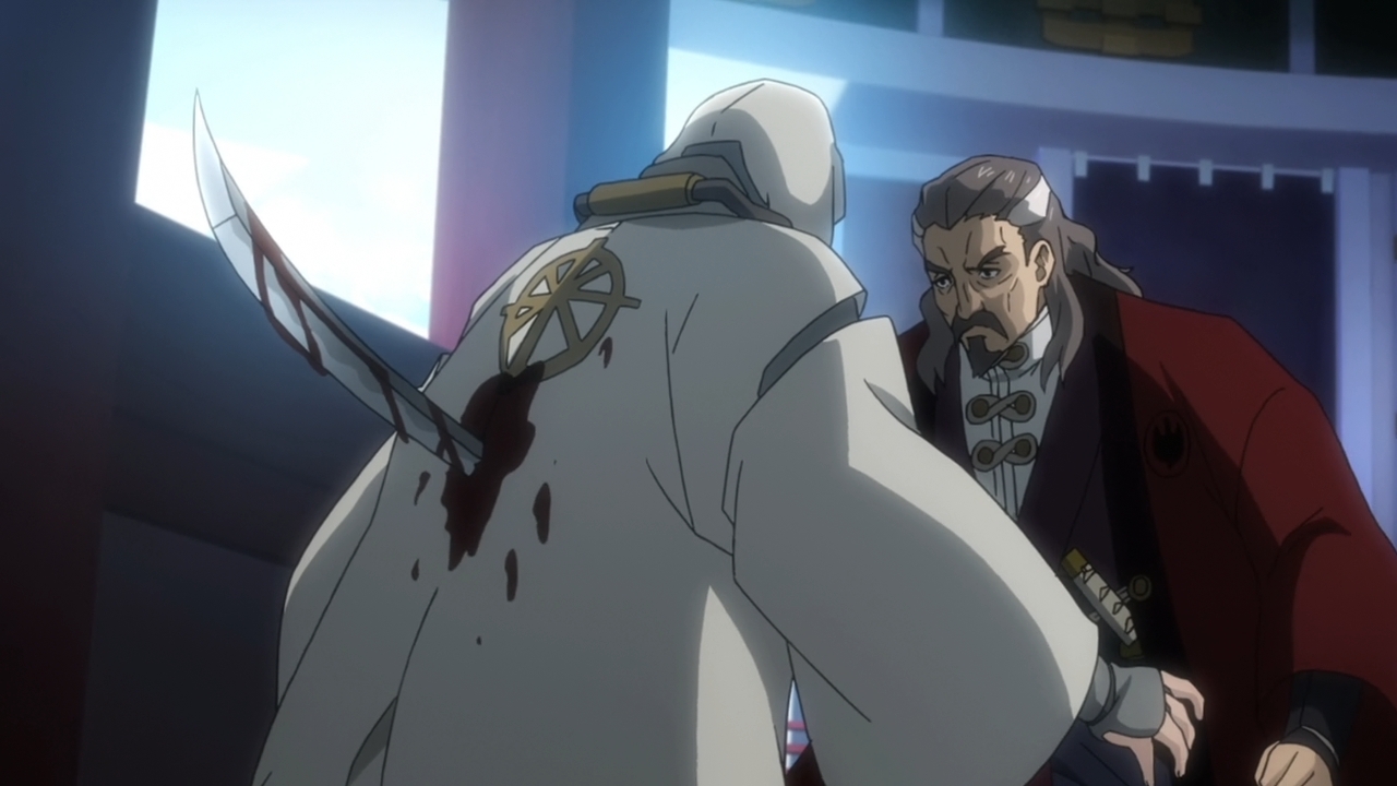 — Back in Kongokaku, Biba’s masterful plan unfolds with perfect precision. He gets his father to grip that very same dagger he had used to attack his son all those years ago. But this time, the dagger has been tainted with the deadly Kabane virus. The shogun soon finds himself turning into a Kabane, and his own men can’t help but gun down their own ruler. Naturally, Biba gets to land the finishing blow.