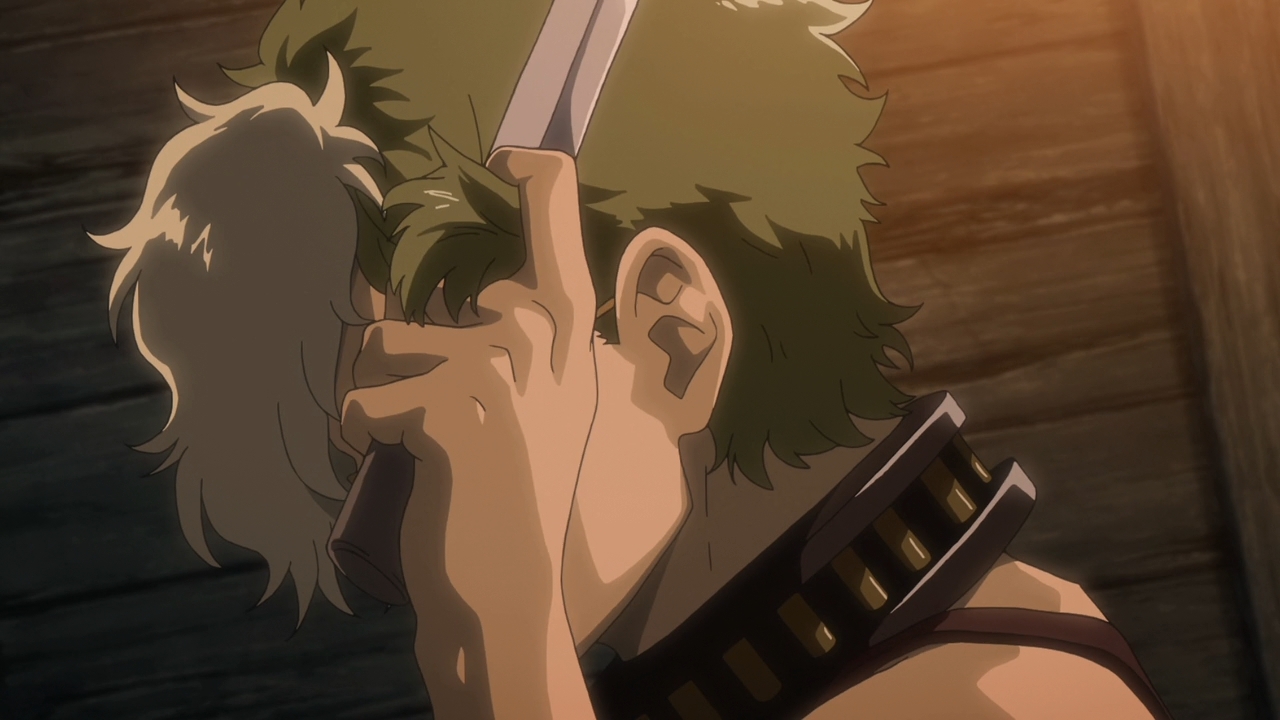 — After the OP, Biba grips a small dagger (knife?), and we see a flashback with him and his father. Something about fear. The lights went out unexpectedly, so the paranoid shogun went on the offensive. When he lit a candle, he saw his own son bleeding before him. You can’t blame Biba’s current monstrous nature on this one event, but I guess things were never the same after this peculiar moment in their relationship.