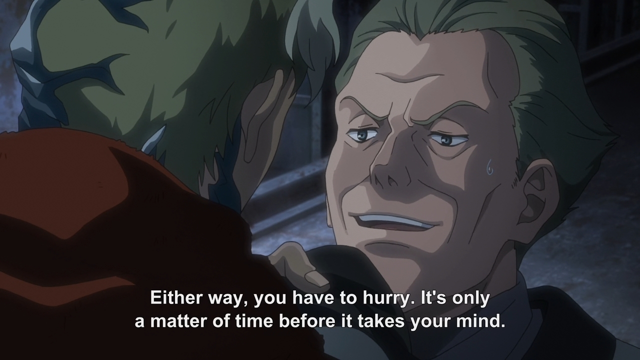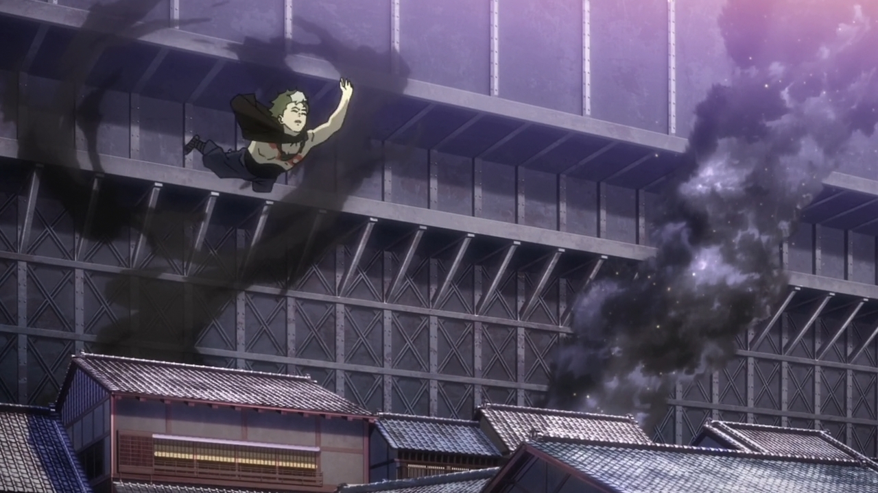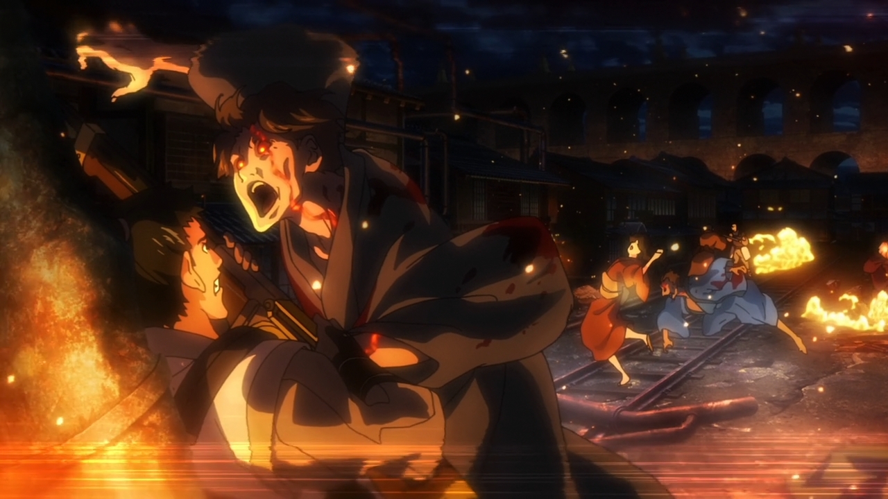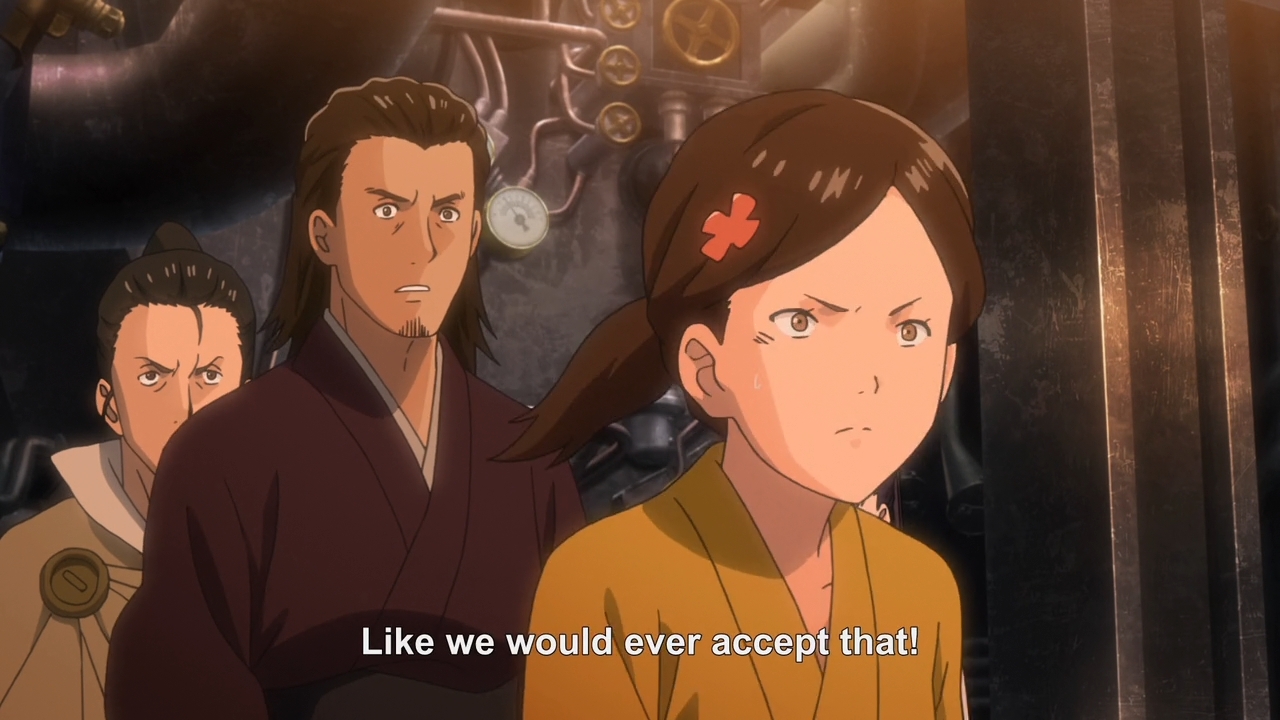 — Other than that, the duel between Ikoma and Biba was just okay. The action wasn’t really all that flashy, nor did they two of them really have a war of words. Overall, the scene lacks a punch of real adrenaline like, say, Kill la Kill’s finale. And that’s the thing… if you’re going to have a crazy moment like a train derailing, because it can’t run over tiny, little Ikoma, then why are you pulling your punches with the final battle between him and Biba? This should’ve been one explosive encounter that really contrasted the difference between our hero’s raw Kabane strength and Biba’s decade of combat experience. Or the contrast between Biba’s sword-wielding elegance and Ikoma’s ugly but practical steam gun? You can be a B-movie action series all you want, but you gotta give me that thrilling final battle.