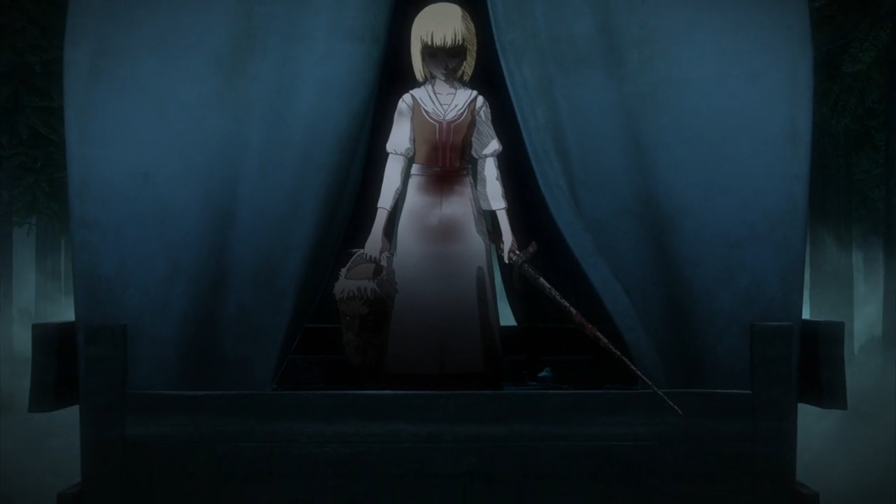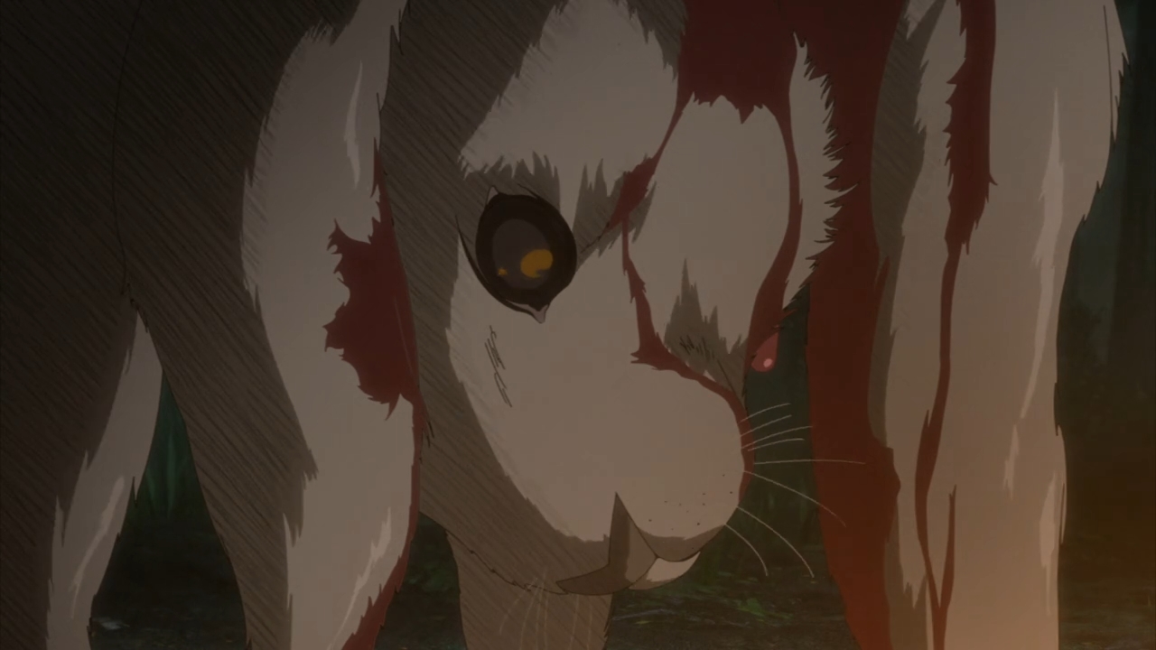 But Berserk reminds you not to get your hopes up. The universe reminds you not to get too attached to any of these characters. There’s a darkly funny moment where Guts entreats the girl to get back into the carriage, but before she can even give him a proper reply, a spear guts her through the abdomen (no pun intended), then the title of the anime flashes across the screen in red, capital letters as if to say, “You’re watching Berserk, bitch!” And inevitably, the old man dies too. Those brutes that followed our hero into the forest don’t even manage to catch up to him. They also meet their horrible, miserable demise in the dark forest. If you’re weak, you will die, and this is a painful fact that Guts repeats to himself at the end of the episode. He looks demented as he treats himself with these cold rationalizations, as if it was all a game. He stuck by the old man and the girl as a gamble. He wasn’t going to go down himself. He can’t go down. Not until he gets his revenge on Griffith. But in the meantime, he may as well play this miserable game where he’ll see if he can try and help these hopeless souls cheat death. Then when Guts inevitably fails to save their lives, another small part of his soul — whatever remains of it — dies with them, and he can only comfort himself with that ghastly philosophy that only the strong will survive. Puck, bearing witness to everything, can’t help but murmur, “This is the world Guts inhabits.”