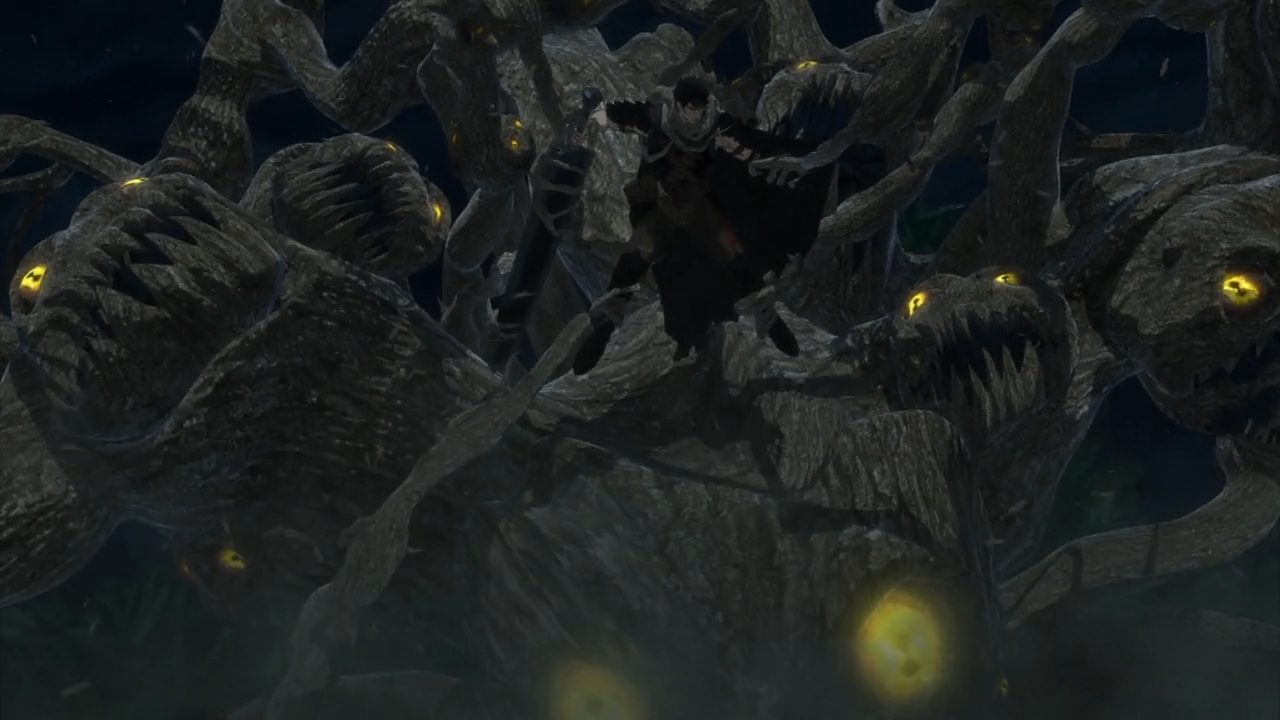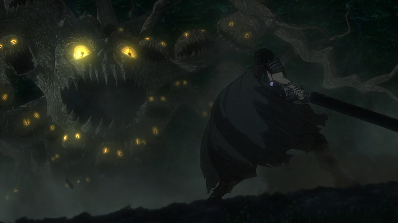 It is still an ugly, brutish world! Even without Griffith and his hellish army, this is not a place for the soft-hearted. Villages are beset by brutes and thugs. Women are dragged into dark dens where they are more than likely mercilessly raped. The strong bully the weak, and had Guts not entered the room, some kid probably would’ve lost his life at the start of the series. But justice here comes in the form of teeth raining from the sky. Guts punches a couple mercenaries in a tavern and blood splatters everywhere, but no one really cares. This is just how it is. This is your ugly, brutish world. It’s a wonder why anyone even steps foot outside of their homes. Well, I suppose you’ve got to eat, but it’s somehow worse outside of the towns. Forests are filled with evil spirits, reanimated skeletons, and murderous trees. Dude, why even bother? If you’re Guts with your broad, 3-foot-across shoulders and the 200 lbs. hulking piece of metal that you call a sword, I suppose you can make it in this universe. And even then, he still needed his prosthetic arm to fight his way free from the tree that so desperately wanted his soul. But where does that leave the rest of us? There are stories that depict the beauty of the human struggle — that no matter how dark and hopeless it gets, we must still endeavor to carry the fire (see: The Road). It’s hard to see that light in Berserk.