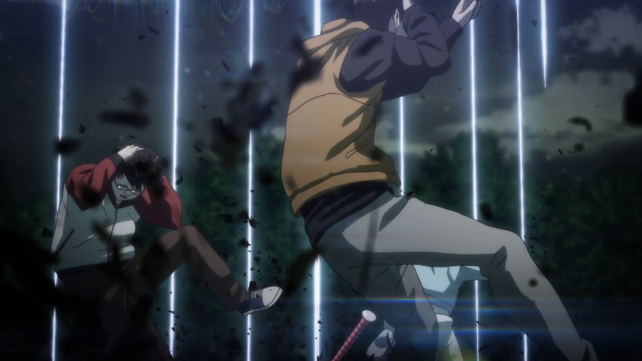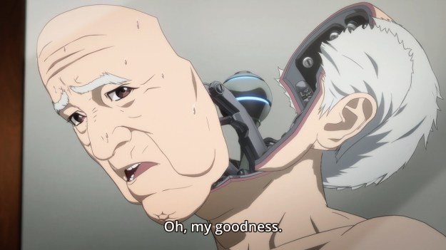 Oh yeah, the aliens. So uh, it’s not clear what the aliens are doing on and around Earth, but they accidentally kill Ichiro and some kid. Well, let’s unfuck the situation and just restore those two back to life. Unfortunately, they don’t have organic matter on hand. They simply have weapon parts. As a result, our protagonist comes back to life as a robot. A very dangerous robot. So we get the usual “What am I? I’m a monsteeeeeeeerrrrrrr!” schtick. Ichiro no longer has to worry about stomach cancer nor does it appear he ever has to eat organic food again (maybe he’ll still need to “refuel” in some other capacity). On the other hand, he laments the fact that he’s unable to cry even though he’s sad, and he blames it on the fact that he’s no longer strictly human. But when he runs into a bunch of punk kids picking on some former vagrant — the man’s apparently not homeless anymore because he’s managed to rent an apartment — Ichiro springs into action. Very specific action. After driving them away with a pretty laser show, he somehow uploads a video of these kids being sociopaths, and IDs them to the rest of the country. That’s some superpower, alright. It’s not entirely clear who’s in control. I don’t think Ichiro’s the one who did all of that, but yeah… More importantly, the good deed of merely stepping in allows the old man to suddenly be able to cry as if he’s still human.