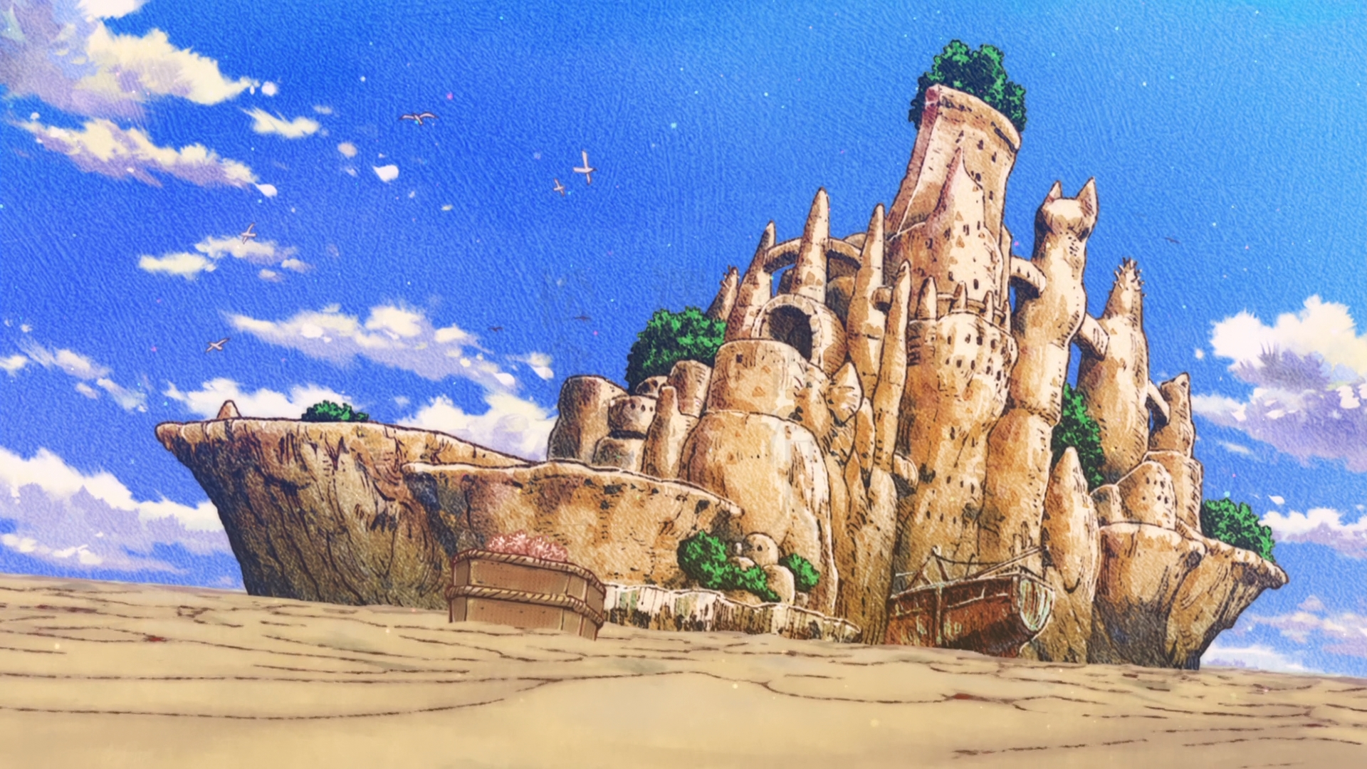 Secondly — and speaking of being cast adrift — what an interesting setting! Chakuro and friends live on a giant castle-boat made out of mud. In fact, they refer to their home-slash-vessel as a Mud Whale, and surrounding them is an endless sea of sand (which must be coarse, rough and irritating — it probably gets everywhere). Every so often, their castle-boat bumps into a driftland, an island from which people can go on expeditions to scavenge for supplies. But this time, Chakuro stumbles upon a mysterious girl, yadda yadda yadda, their lives will never be the same again. You thus can’t help but wonder why the world is like this. What happened to the rest of humanity? What do you mean the people of Falaina are sinners? Why is it necessary to pursue and kill what appears to be peaceful nomadic community? Naturally, it’s too early for the show to divulge its secrets.