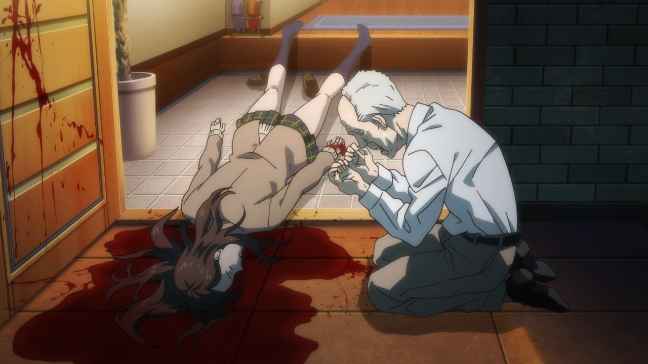 From the moment Hiro picked his victim to the drowning kid’s final death throes, there is no background music. One less illusion, I suppose. One less obstacle to distract the audience from the unflinching monstrosity unfolding before us. Luckily, there’s no escaping the fact that this is an animated work. Could you imagine watching a live action version of Hiro’s murders? Christ, I can still remember the father’s anguished, guttural cry when Hiro tells him as-matter-of-factly that he is killing the kid as well. I can still remember the tears and snot streaming down the man’s face after learning that his wife is dead. Hiro quickly disposes of the man. We are then trapped in the room, forced to watch helplessly as the man’s body pushes the kid down into the bloody bath water. The kid’s arms flail futilely. Fuck, man. This is the sort of unforgiving realism that I expect from Portrait of a Serial Killer, not an anime that — in last week’s episode — had previously seemed so dopey. In fact, as I witness Hiro’s crimes, I couldn’t help but think, “Did the anime really need to go this far? Was it really necessary to watch a kid die like that?” Therein lies the true efficacy of the episode’s horror.