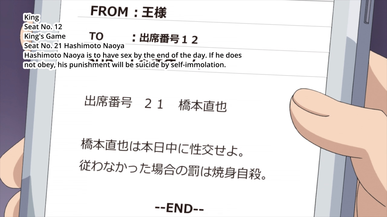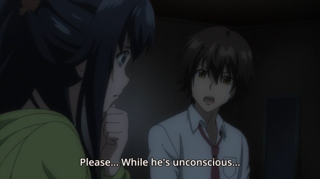 In yet another flashback, the mysterious King orders Naoya to have sex before the day’s over. But oh no, there’s only ten minutes left! What are we to do? Nobuaki springs into action; he shoves both Naoya and his girlfriend into a dark room and begs them to do the deed. Naoya doesn’t want to go through with it, though. He already indirectly played a part in another girl’s death (plot twist: not every punishment results in death, but you’re free to kill yourself thinking that you’re going to die anyway). Even though Chiemi is technically willing to have sex with him to save his life, he doesn’t want yet another stain on his conscience. That seems reasonable. I get how he feels. I wouldn’t go through with it either. But what does our righteous hero do? He enters the room and punches his best friend out. He then begs Chiemi to take care of the problem. Okay, okay, hold up. Technically, Naoya just has to have sex. He doesn’t have to have sex with a girl. If Nobuaki is such a bro, why not take one for the team?