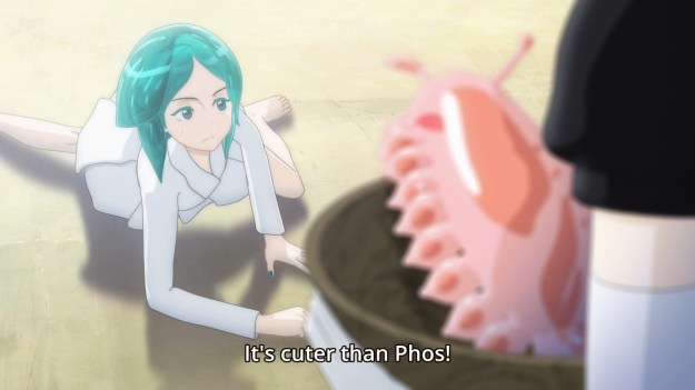 Maybe the other gems were right after all. Maybe they could’ve and should’ve waited a little longer to lift a finger for Phos’s sake. Meanwhile, Kongo has been absent this whole time. Busy meditating, I’m sure. All this talk about change from within and rebirth, and the first thing Phos does is cause a scene. I know we’re supposed to take notice of the fact that Phos can somehow understand slugspeak. Still, I can’t help but feel like we just spent twenty minutes to establish that the slug is a new and important character. Plus, there’s this anime/manga thing of employing basic archetypes, and merely promising to develop them into deep and interesting characters far, far down the line. If the story can pull it off, great, but the drawback is that the early episodes are always a drag. You’re just tapping your foot, waiting for the good stuff to finally happen.