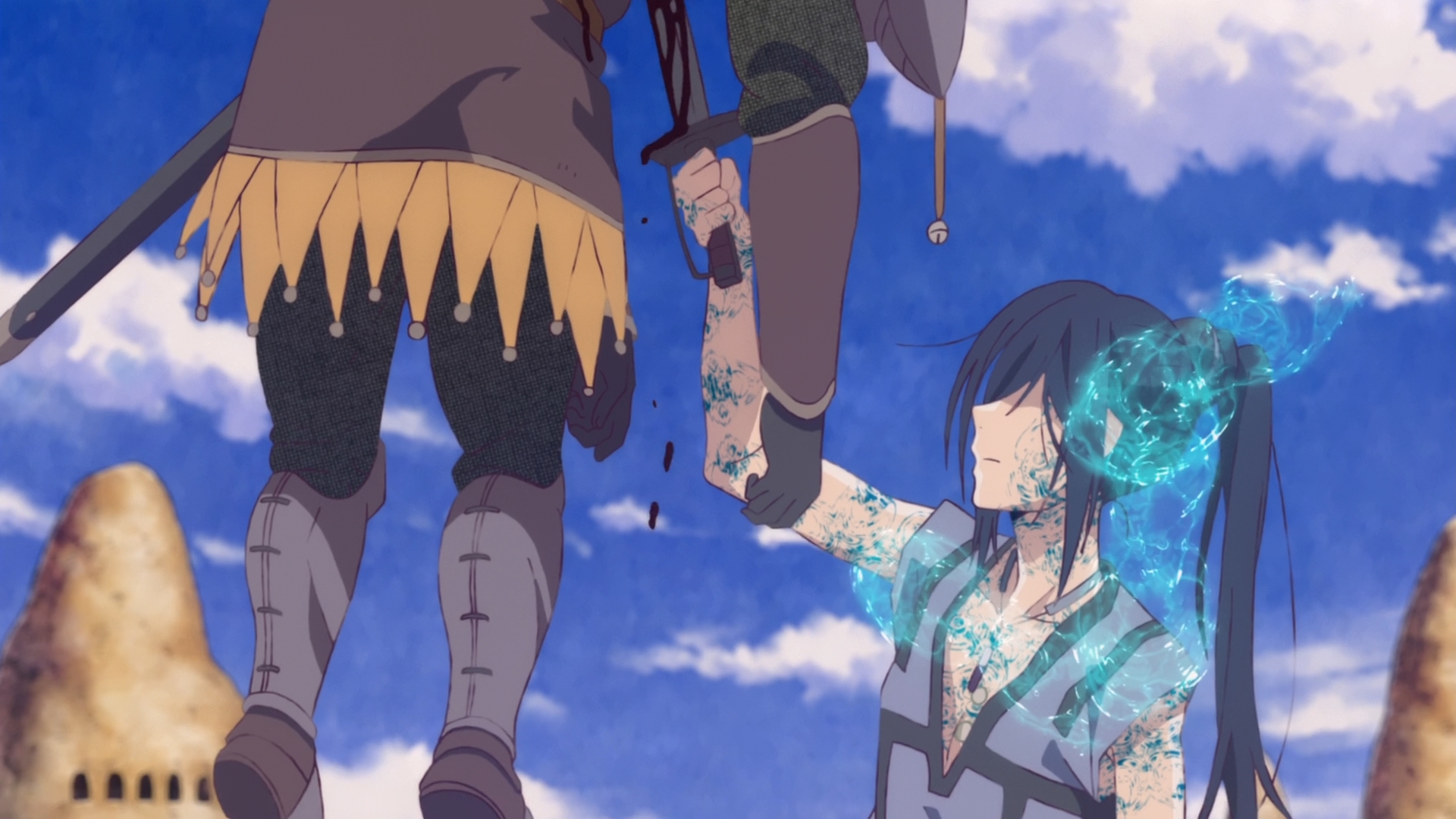 Chakuro holds Sami’s lifeless body in his arms and closes his eyes. He’s more a scholar than a fighter. He’s ready to die. But for some fucking reason, three little kids — the same three kids that Chakuro lives with — come running at him, screaming for their brother. Oh ho, more defenseless children to slaughter! Well, why don’t we try parlaying? No? How ’bout getting on our knees and begging for mercy? Hmm, that doesn’t seem to work either. I guess our hero has no choice but to suddenly ignite this thymia and do battle. Here’s where some of you might misunderstand me. I don’t care that Chakuro is fighting back. Sometimes, you do have to fight back. What I hate is the way violence is being used. It’s not consistent in its portrayal. One minute, children are dying left and right without mercy. Another minute, it slows down so the heroes can look cool.