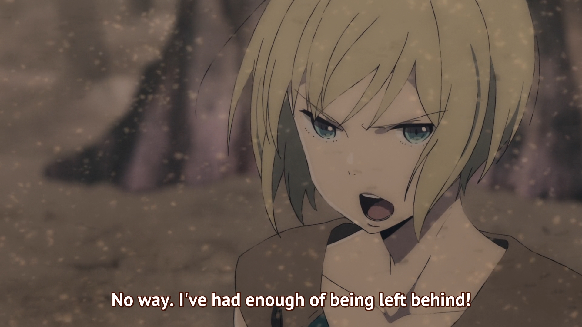 As for our archivist, feelings are starting to deepen on Lykos’s side as they are wont to do. She clutches her heart in anguish shortly after gifting Chakuro an outfit that she had sewn herself. Unfortunately, Sami’s death is still fresh on everyone’s minds, and this includes our boy hero. And even if he didn’t have that baggage to deal with, he’s the sort of anime protagonist to be completely oblivious to a girl’s feelings unless she spells it out to him in big, bold letters. So around the final minutes of the last episode, probably. Luckily, the other young girls have taken to her, so she can always just complain to them about how Chakuro is so insensitive and blind to her feelings (if they’re still alive in a couple episodes). Boys just can’t understand a girl’s heart, am I right? But to be fair, he’s got bigger mysteries to deal with, like Neri’s supposed twin sister Ema. She makes him promise to protect the island, but refuses to answer to any of the kid’s questions. It’s not time for the audience to know yet, so um, yeah… just fly around with those fancy wings and laugh like a maniac. She always does it when nobody else is looking, so even if Chakuro tries to tell people about Ema, they’d just think he’s crazy. Ironic… considering how the girl’s definitely got a few screws loose up there.