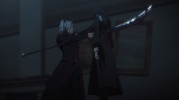 Alas, poor Sister… we hardly knew ye. But can you believe it? After seven weeks, Garo – Vanishing Line is finally getting underway. I am honestly a little bummed to see the nun die. In order to protect the orphans — they’re practically her children now — she was so ready to throwdown against a Horror despite being nothing more than a mere human. Unlike the Garo Knights and Alchemists, she has no special powers. She’s just a badass nun who knows martial arts, and in the end, it was of little help. Her opponent could’ve transformed into a full-fledged Horror at any moment to finish her off, but instead, it chose to play with its food. What a classic bad guy mistake. So when I saw the woman impaled through the shoulders, I thought she still had a chance to see those kids again. If you’re not going to finish her off now, then this is surely the golden opportunity for Sword to show up in the nick of time and save the day, right? I mean, c’mon, what will the orphans do without her? But no, the anime still kills her off. Her blood is then sadistically splattered across Sophie’s face, which is going to take a few therapy sessions in her adult years to fix. But more than anything, if Garo never addresses the orphans’ fate, I’m going to be sorely disappointed. But we’ll wait and see. For now, we finally have an actual villain to contend with.