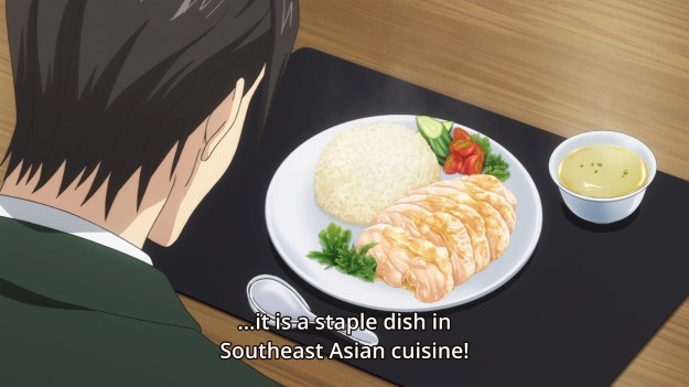 Pre-grated parmesan from a container? Bruh. Did they have to make it look so much like Kraft, too? I can let the wing “gyoza” thing slide, but c’mon man, you couldn’t bother to grate parmesan cheese on the fly? Actually, let’s back that up a bit: I’m not sure I can let the wing “gyoza” thing slide. Dude, that’s just Thai angel wings. Why are we calling it a gyoza? If he had removed the chicken skin, then used it like a dumpling wrapper, then sure. That’s kinda gyoza-ish. But let’s just call a spade a spade, and Yukihira definitely made angel wings. After all, Eizan made Hainanese chicken rice, a.k.a. khao mun gai. It’s almost as if Thai cuisine served as the underlying inspiration, and yet, we’re pulling all sorts of mental acrobatics to call those angel wings “gyozas.” Sure, sure.