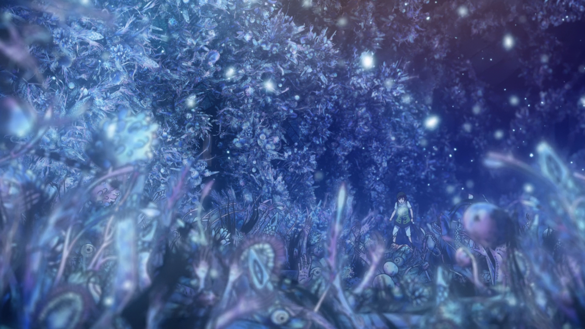 Eventually, Ouni’s destructive power reaches the nous, and the little girl equivalent to Ema is cut down. All of a sudden, those same fluorescent arms that we had seen on Falaina in last week’s episode explodes out of this nous and takes over the entire enemy ship. The floor, the walls, the ceiling — everything is now covered with… something that resembles underwater sea fauna? That’s the best description I can come up with. Visually, this part of the anime is legitimately pretty darn impressive. I gotta give credit where credit’s due, and Children of the Whales has always been a splendor to behold. Well, for a TV anime anyways.