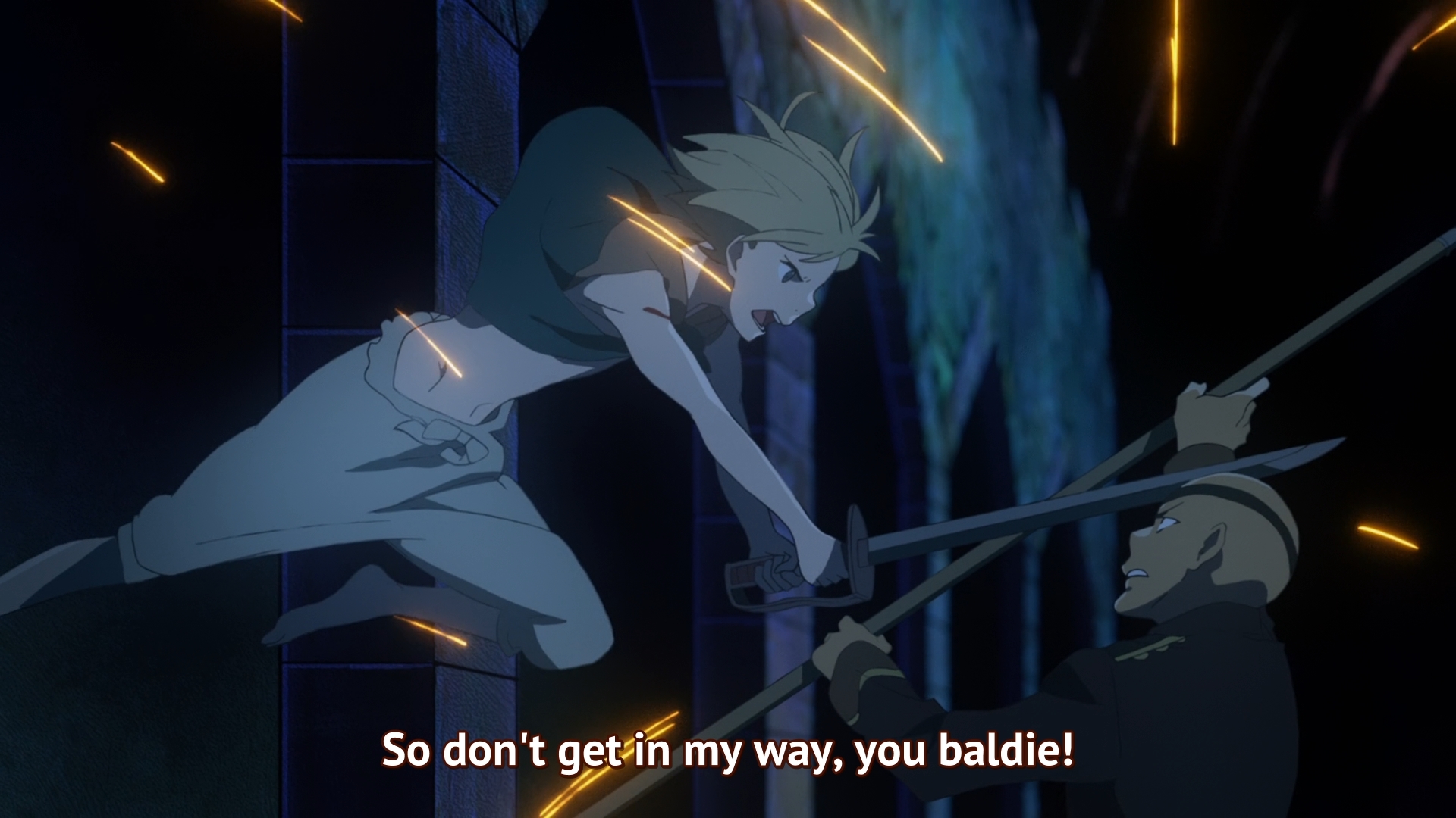 We return to Skylos where the bad guys have the good guys cornered. The enemy commander (again, these characters are too unmemorable for me to remember their names) tosses a sword at his bald henchman, and the latter proceeds to deliver a few painful blows to Ouni’s body. What are they attempting to do? Awaken the daimon inside him? Seeing no reaction, however, Baldie thinks to himself: “The daimons of Falaina… I suppose they were just a superstition.” Oooh, the show is so predictable, it hurts. We all know what’s going to happen next. You know it, I know it, we all know it: in order for hero characters like Ouni to awaken to their true powers, there must always be a sacrifice. Someone close to them must always die a painful death. And guess who’s still alive… that’s right! It’s Nibi. Who better to kill off than the hero’s best friend! Once Nibi is dying in his arms, you’re guaranteed to activate Ouni’s s-cel-… eh, thymia.