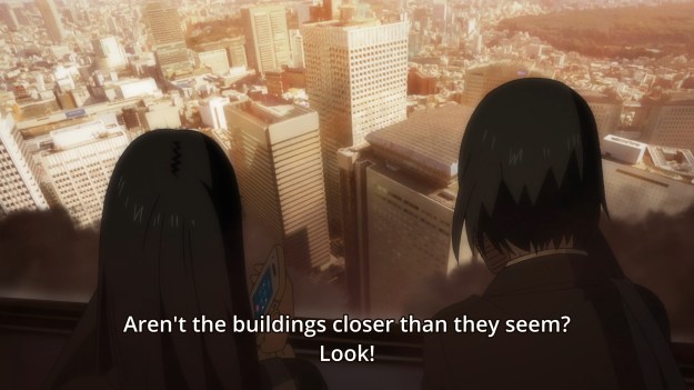 It’s also weird to me that Ichiro can now remote control several jumbo jets at the same time. Not only that, he has to contend with Hiro also trying to bring those planes crashing down into the city. In a previous episode, we saw the old man barely manage to control a single car. Since when did he go from zero to hero? I guess he always had it in him, and this desperate situation served to bring out the best that had remained dormant up until now. But considering how the last few episodes have been nothing but The Hiro Mass Murdering Extravaganza, maybe we could’ve and should’ve devoted a little more time to the actual protagonist of the series. Maybe. I also don’t like how Ichiro fights back by making machine gun noises of his own as well. After all, I thought the noises were only “necessary” for Hiro, because he’s still rather childish. It’s a dark part of his childhood fantasy come true or something. He reads a lot of manga, so he’s imagining himself in a manga making the same onomatopoeia as some of his favorite fictional characters. But no, apparently Ichiro has to make the same noises too if he wants to use his machine gun abilities. As a result, you have two “men” going TUH-TUH-TUH-TUH-TUH-TUH-TUH-TUH-TUH-TUH-TUH-TUH at each other, and I’m just sitting there like, “What the fuck am I watching?”