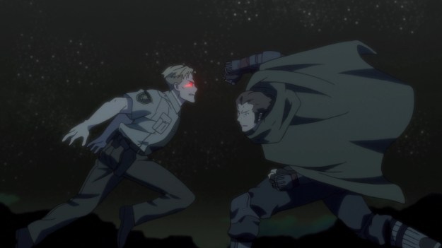 Unfortunately, Alfil is actually a Horror in the employ of Bishop, and for the past two years, both of them have merely been using San Del Dios as a feeding ground. With Sword coming into town, Alfil has convinced the vigilante group that Sword is a serial kidnapper and killer. It’s not really easy to verify information out here, and everyone trusts Alfil anyway. As a result, the town pulls out all the guns for Sword’s arrival. Our hero can’t raise a finger against humans, so we just get a comedic chase scene through San Del Dios. He tries to escape, but they’ve already gone ahead and chained his bike down. When it’s near time for the episode to come to an end, Gina shows up in just the nick of time to pull Sword’s ass out of the fire. He then does what we expect him to do: he rescues Sophie and defeats Alfil. With his plans foiled, Bishop presses a button which causes San Dell Dios to self-destruct