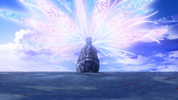 Back on Falaina, everyone gathers together on the surface of the Mud Whale. Thanks to a little fairy girl paying each of the Marked a visit in last week’s episode, they can now sing the song of their people. Giant, shimmering wings sprout suddenly from the ship, and we are told that Falaina is no longer rudderless. Its people can now escape their prison, which was apparently a region of the sea that has long been deemed evil. Why? Probably because its currents are inescapable unless you have the power of the nous to push through them. Obviously, this gives the Empire a massive naval advantage, and you can see why they don’t want rival countries to get their hands on a fully operational battle station nous. But what do the people of Falaina want? They’re still nothing more than a fledgling community comprised of mostly children. They’ve managed to repel an attack from the Empire, but not without suffering heavy casualties. Falaina obviously needs allies, so it makes sense to side with Siderasia, no? This is what Rochalito encourages, but his nation obviously stands to benefit greatly from Falaina’s cooperation. Suou really shouldn’t trust the sweet words of a political leader he’s just met (or any political leader, honestly).