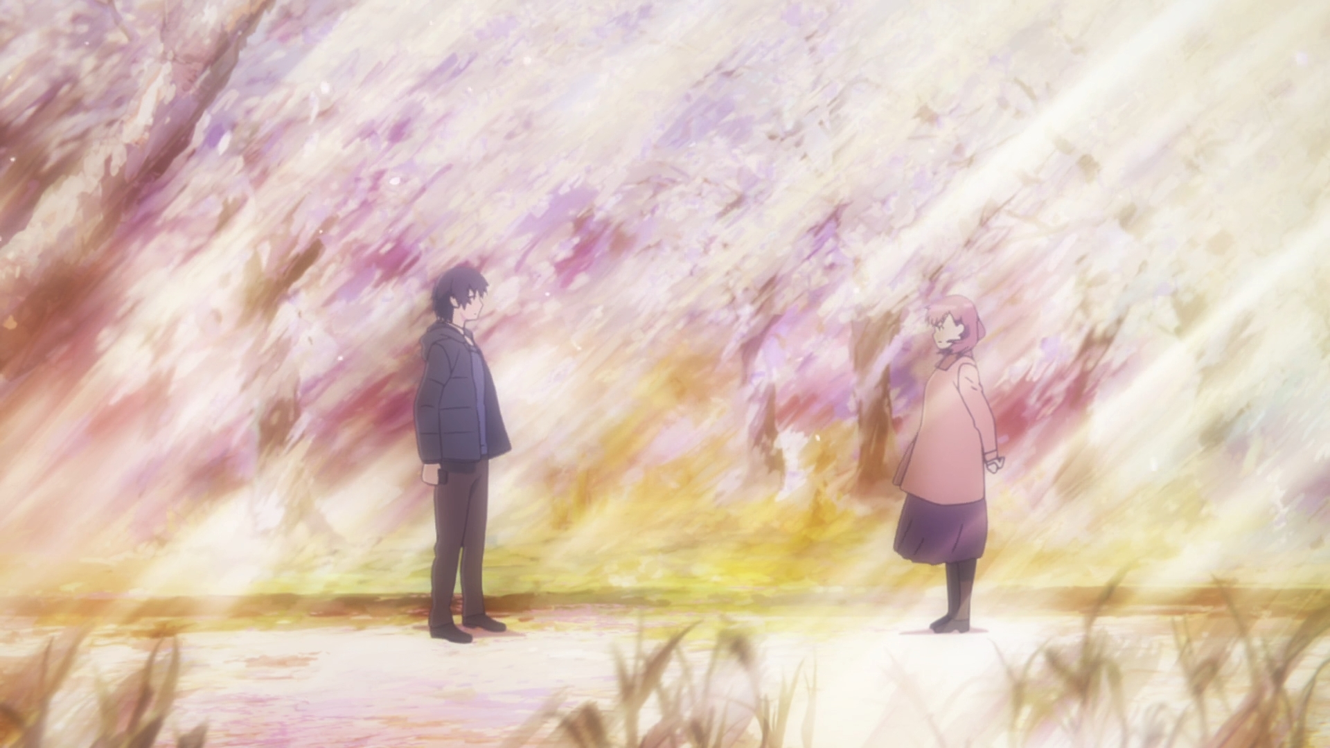 I guess my issue is that the one month of no contact issue really stretches credulity. I feel like the writer had in his head exactly how he wanted the show to end. They’re going to meet at the university under the cherry blossoms, and he’ll finally confess his feelings. She’ll confess back, and it’ll be perfect! They’ll have their entire future ahead of them! All we’ve gotta do is make our way there. So in order to set this up, these two have to somehow avoid seeing and contacting each other. ‘Cause look, what would common sense dictate? Ah, we couldn’t meet up on the last day of school, so let’s meet up tomorrow! Oh, you’re busy tomorrow too? Let’s meet up sometime next week then! Great! Or if they can’t meet up at all, just pick up the damn phone and call each other! A love confession over the phone isn’t as romantic, but it still gets the job done — especially when you’ve been pining for the girl for years and years. Common sense, however, doesn’t get you that beautiful confession, so somehow — magically — Mio ignores Eita’s reply. And somehow, even though she couldn’t find him on their last day of high school, she finds him on a much larger campus, and they live happily ever after.