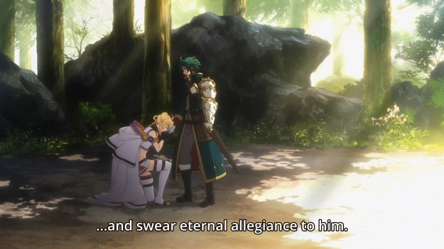 Enter Theo. He has a Crest, but it’s an itty-bitty one. It’s so small, he can’t even be a knight. Yeah, so uh, Crests can have ranks and you need to power your Crest up by absorbing Chaos into it…? And you get more Chaos by defeating demons, I bet. All in all, it feels very video gamey. Naturally, this is an adaptation of a light novel that also inspired a table-top game, so what more can I expect, right? Anyway, Theo comes from a land torn apart by greedy nobles, but that seems to be the case everywhere. But this backstory is enough to explain why he’s on this grand quest to achieve world peace or whatever. He just needs to level up a little. In the meantime, he makes up for his lack of abilities by having a huge heart. He fights off the soldiers in a not-so-impressive fashion. This is due to the fact that he’s not very skilled yet, but also because the animation just feels very uninspired.