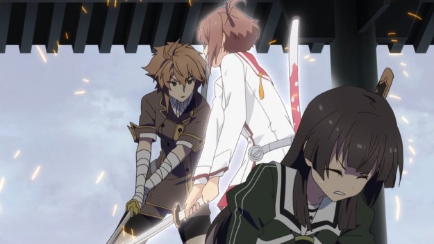 Sword-wielding shrine maidens are our only defense against aradama (aratama?), which are… evil creatures, I guess? Where do they come from? What are they made of? These are details that the series deem too unimportant to delve into at the moment. Rather, we see a squadron of shrine maidens face off against a giant and poorly-animated centipede of some sort. They’re in school uniforms, but they don “special equipment” to augment their fighting abilities. Augmented or not, the girls’ itty-bitty weapons can naturally block the centipede’s attacks with ease. I guess the monsters might look big, but they really weigh nothing. There’s no other way to explain how a 90-lbs schoolgirl can withstand those blows. Oh right, magic…