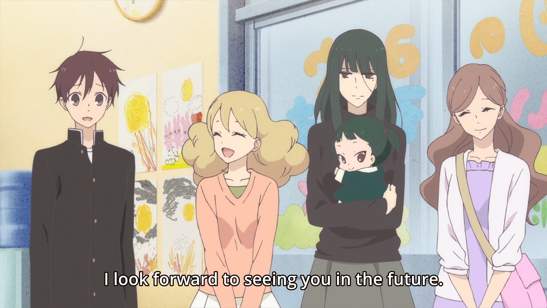 When the kids’ mothers finally show up to pick up their kids, there’s nobody but Ryuichi to greet them. One of the mothers doesn’t even recognize him at first. That doesn’t… sound very comforting to me. I’d be a little worried to see my kid in the hands of some middle school student. Nevertheless, everyone’s just so happy and accepting of the current situation. Again, the show lacks complexity. Almost everything is one-dimensional. Ryuichi has a tremendous burden on his shoulders, and he bears it with no ill will whatsoever. The parents return to see their kids with a relative stranger, and they wear nothing but beaming smiles on their faces. Much of this show is simplistic and boring.