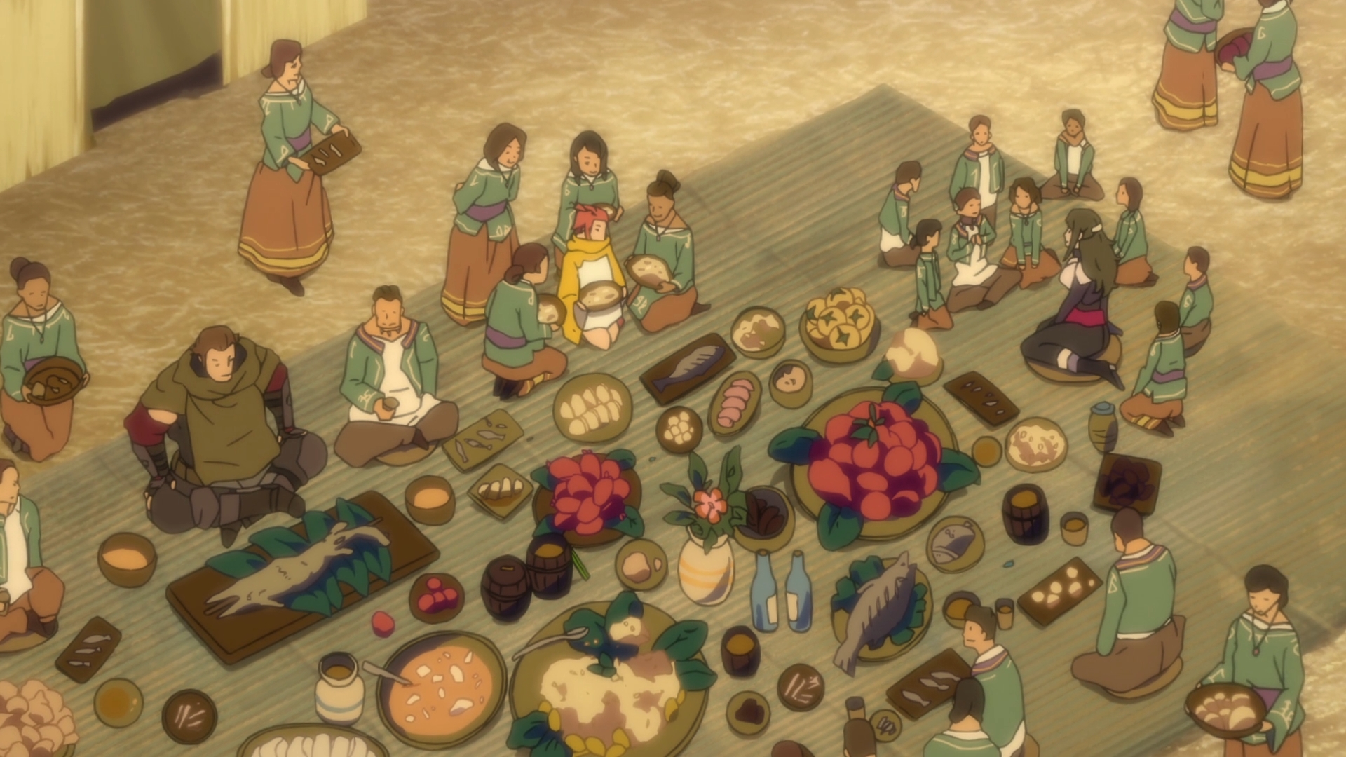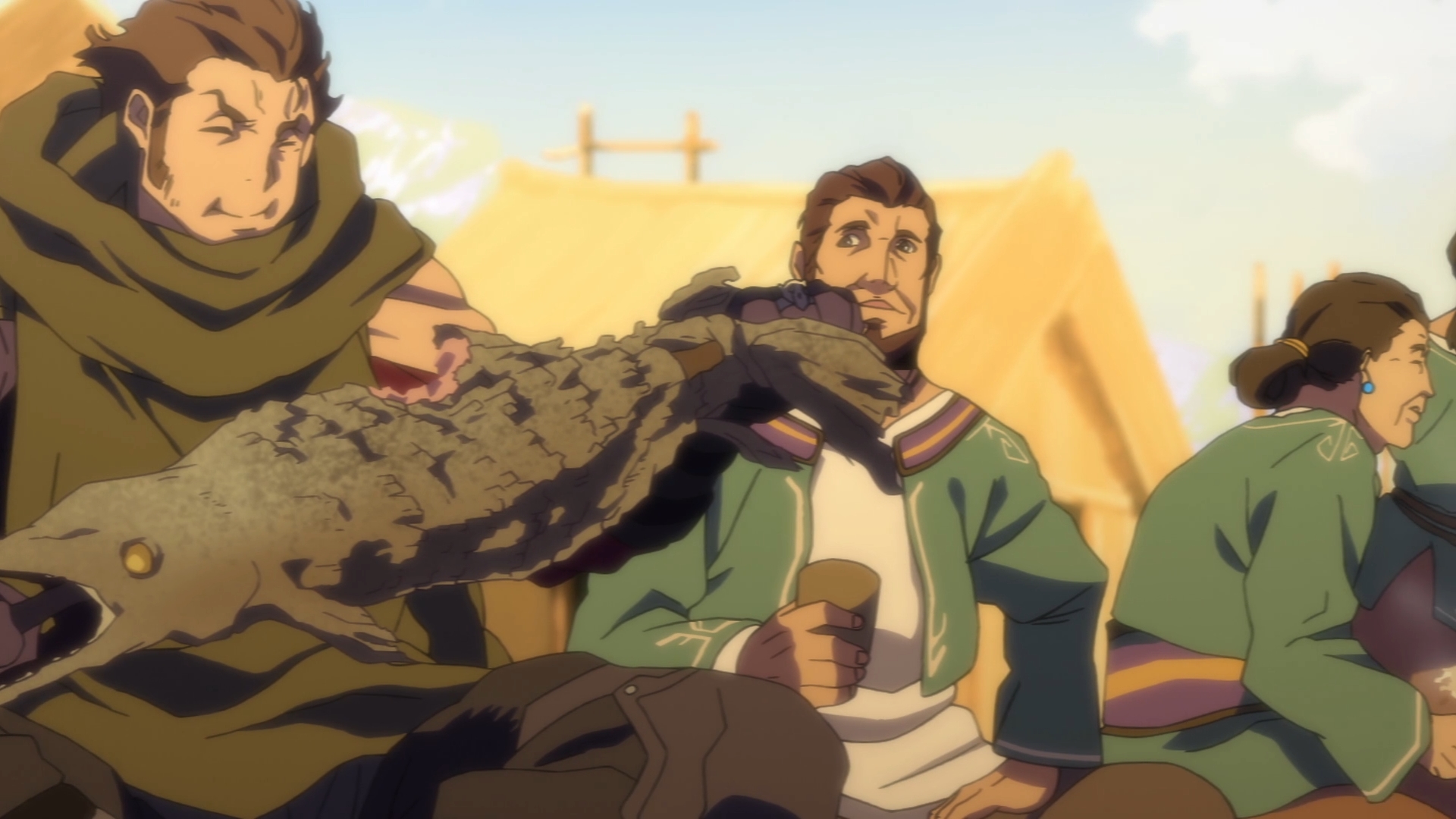— That’s a lot of food for an isolated village up in the mountains. Somehow, there’s even spit-roasted alligator, which Sword happily bites into, skin and all. That’s a man who enjoys his meat. I can’t say I’ve ever had alligator meat nor do I ever want to.