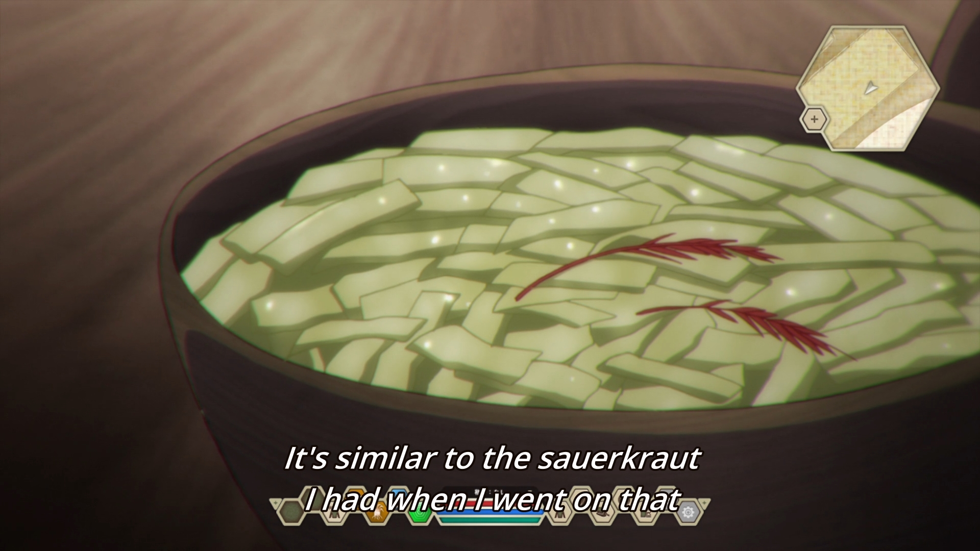 — And to go along with the quiche, here’s some of the saddest looking cabbage I’ve ever seen. I thought they were spinach fettuccine or something. But no, from the characters’ descriptions of the dish, it appears to be sauerkraut.