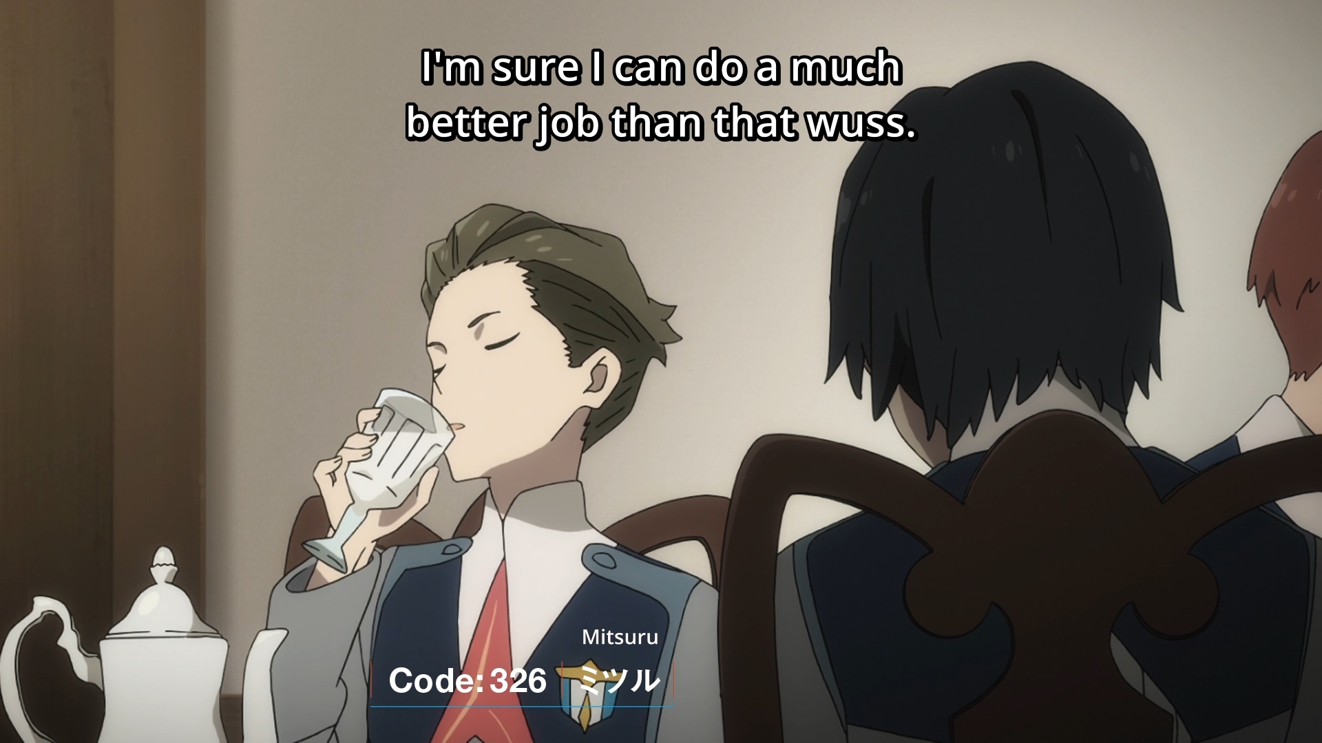 Miku and Zorome command the Argentea. The guy seems to have a bit of an Napoleonic complex. He obviously thinks he’s hot stuff, and it didn’t help that Zero-Two treats him like a piece of napkin. On the other hand, Miku is talkative, but I don’t know much else about her. She still seems nice? When Zorome stupidly suggests aloud that maybe he should pilot the Delphinium instead, the trust between them is shattered. That’ll probably be a major subplot in next week’s episode.