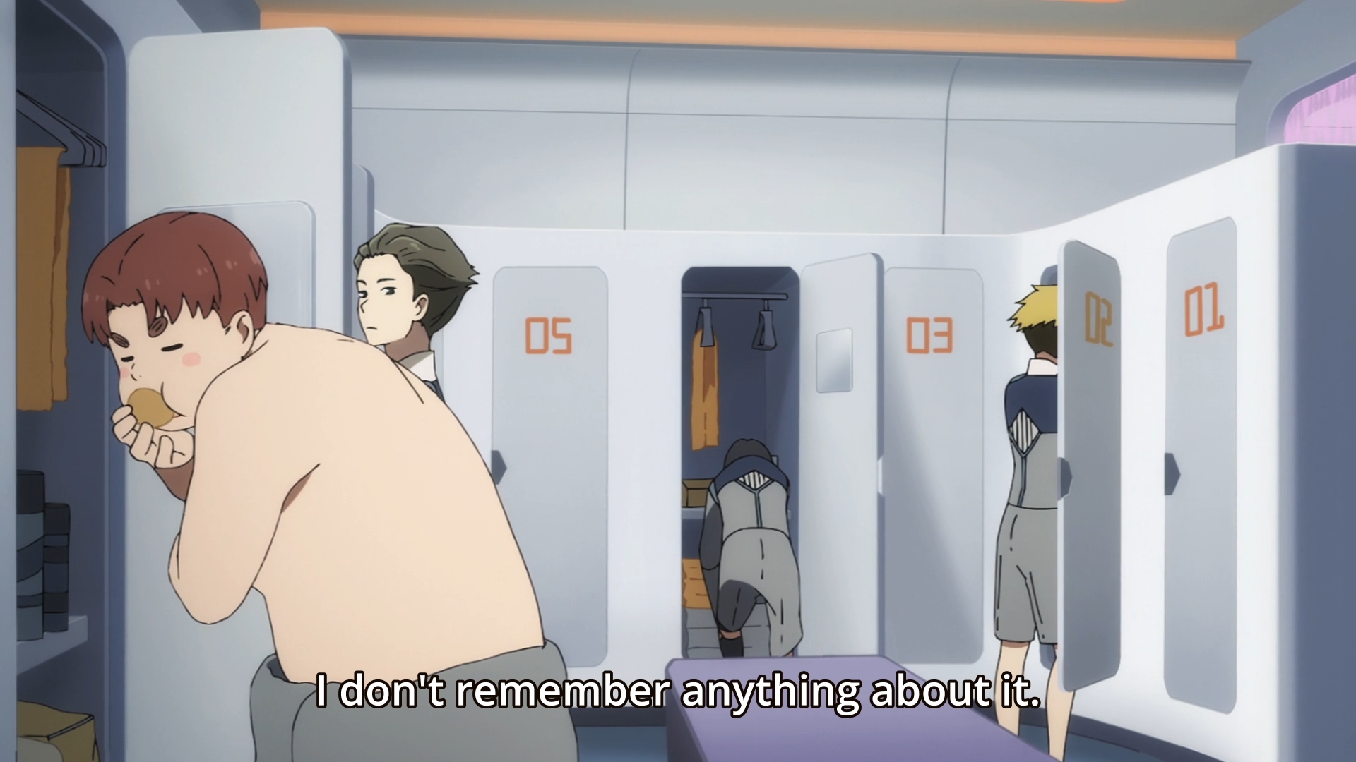 — Futoshi seems to have food hidden even in his locker. Look at him greedily munching away right before a training exercise.