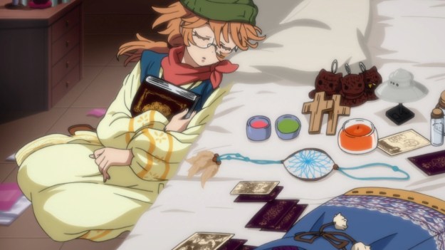 Stella is so cheerful and cute, it’s almost as if she belongs to a different anime. In fact, this whole episode just feels… weird. For one, it’s littered with slapstick humor. When we first meet Stella, her grandpa opens the door in her face and the girl goes down. Later in the episode, she somehow manages to lose her grandpa in his wheelchair, so he goes flying off into the distance. She then chases after him, but trips and ends up flipping over him. I mean, just look at the old man’s face. Eventually, it’s time for Luke to face off against the Horror of the Week. The tension is rising, the music is swelling — look, things are about to go down, my dudes. Then all of a sudden, the music cuts out and this blobby thing hits the Horror’s magical seal. Uh, what? Luke looks behind him to see Stella doing her best Ghostbusters impersonation. This episode is so goofy, I actually like it.