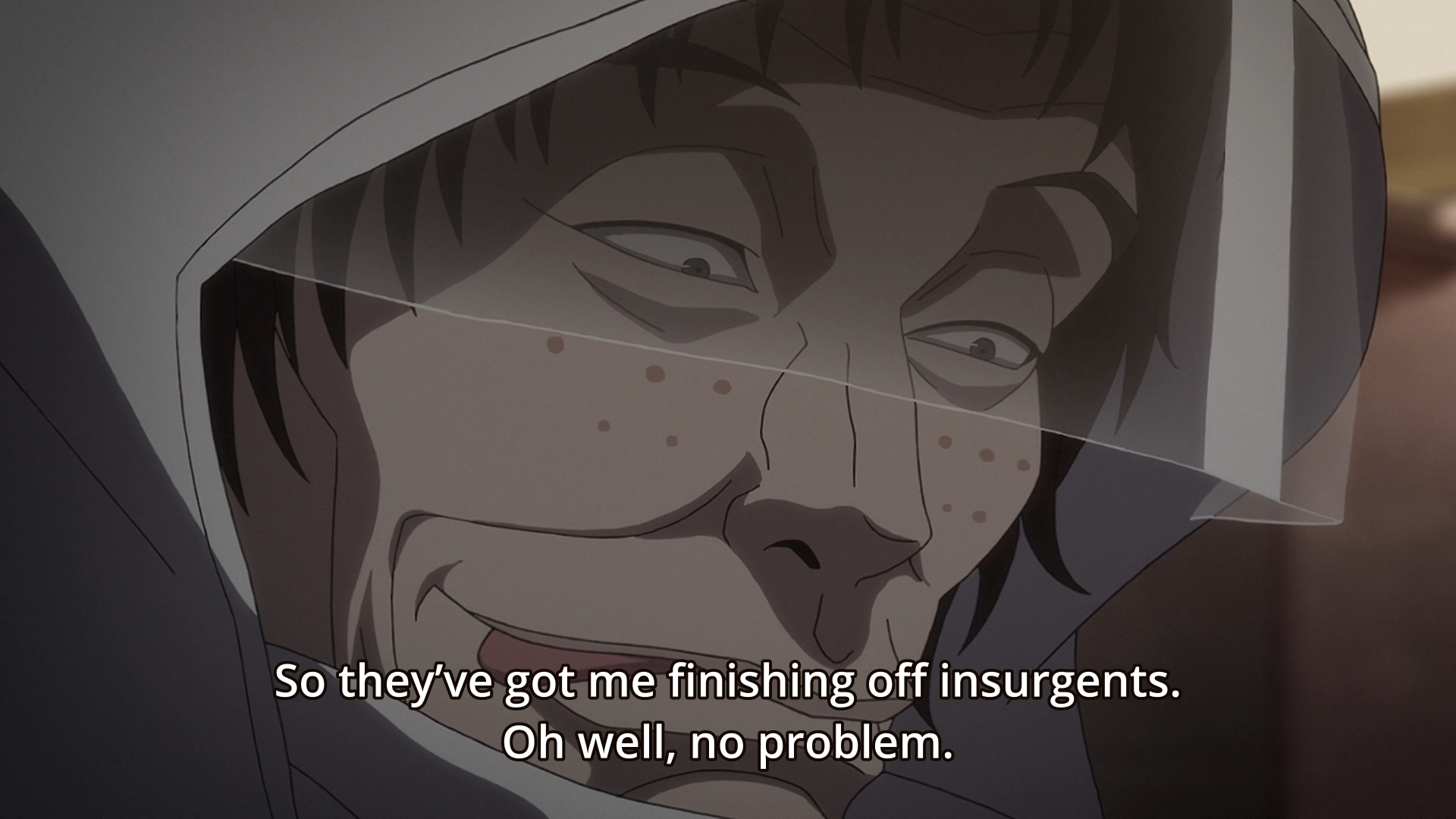 Elsewhere, Sagawa seems to be conducting an experiment. They tell an unlucky goon to execute one of their own, which triggers the appearance of The Herald. Naturally, the unlucky goon gets his head smashed in. Sagawa notes, however, that The Herald is even smaller this time around. He somehow deduces that the size is directly tied to the being’s energy levels. I find this kinda odd. There could be a lot of reasons why it’s smaller the second time around. Honestly, this just feels like a flimsy justification for why The Herald might not show up later in the story. In other words, if the being uses up too much energy, you might be able to kill someone in Stasis without incurring The Herald’s wrath.