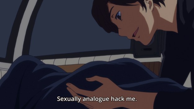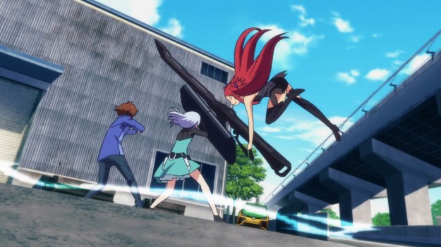 He asks his two dear friends for help, and I guess you can track hIEs through something called the antibody network. I’m not sure what that is. Has the story ever mentioned this before? In any case, Kengo and Ryo manage to help Arato chase down Lacia’s kidnapper. This results in a super exciting chase scene through empty, sterile streets. But all of sudden, Ryo becomes suspicious. Isn’t this all just a little bit too easy? In fact, Lacia’s giant black shield thing has gone missing from Arato’s home. It’s almost as if Lacia engineered this whole incident to get Arato to come chasing after her. But for what? Is she testing him? Testing his worth? Ryo then suggests that perhaps Lacia is a Red Box. Again, more jargon from the story. I don’t know what a Red Box is other than that it was apparently created by yet another AI. So an AI created an AI. This is getting out of hand.