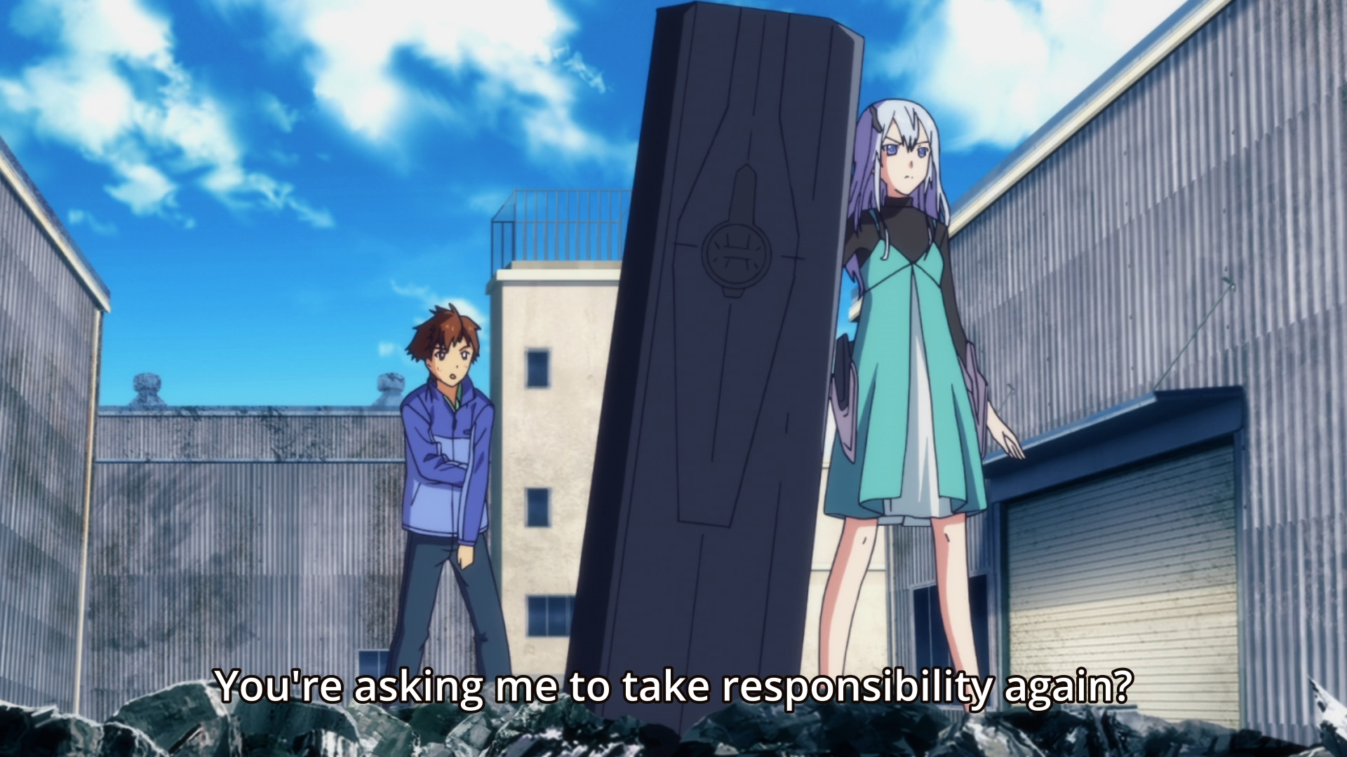 …it’s because there’s a limiter on her weapon, and she needs Arato’s permission to let her go hog wild. Again, she claims that he needs to take full responsibility. He finally relents and tells her to fight with him.
