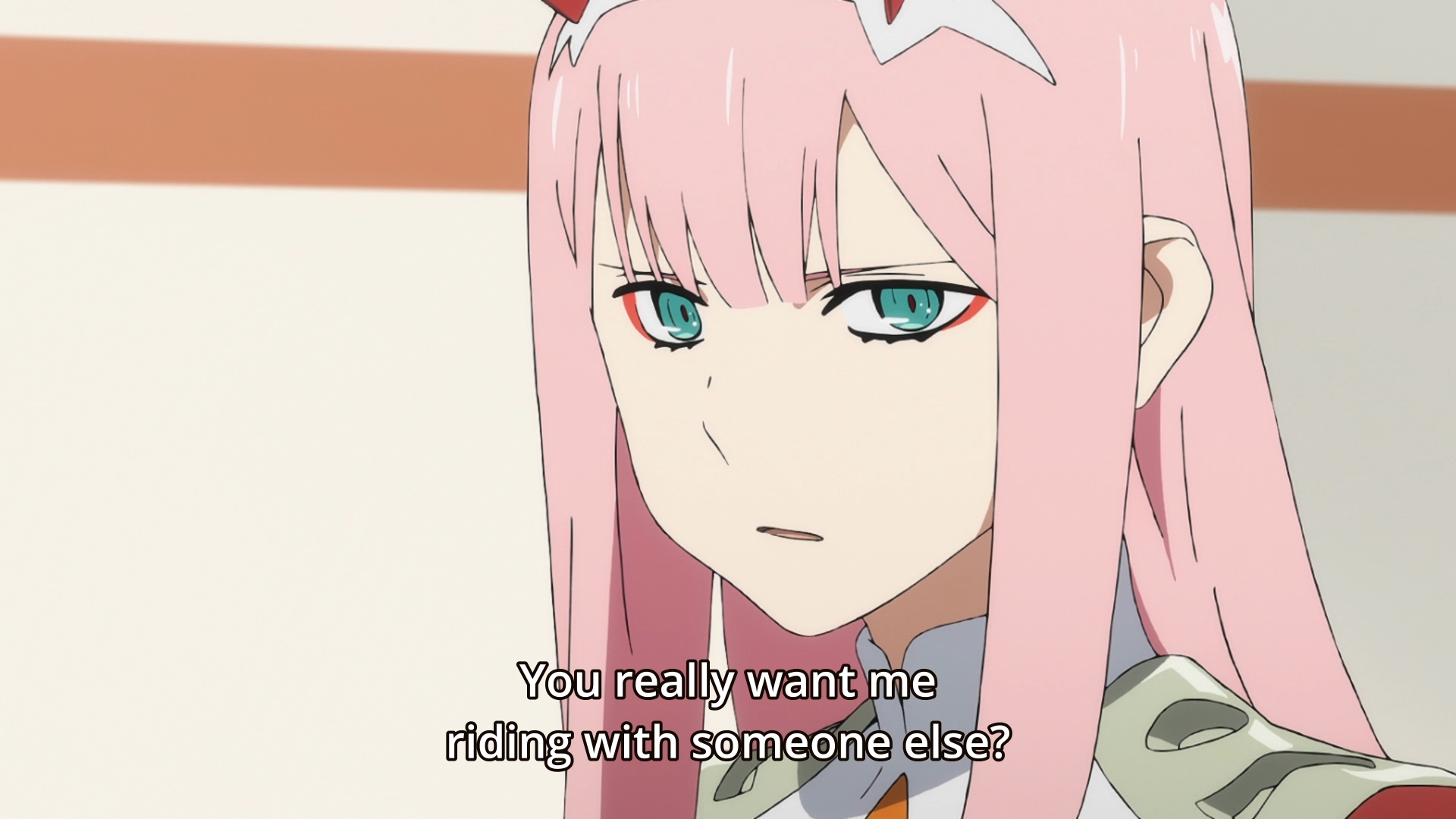 That isn’t to say that everything is perfect. That isn’t to say that systemic issues between the sexes don’t remain to be tackled and solved. And don’t get me wrong — I certainly don’t think Darling in the FranXX is some genius anime attempting to make some grand point about the nature of things. But ultimately, people see what they want to see. They see the guys firmly grasp the controls extruding from the girls’ buttocks and think that there’s an inherent power imbalance. But as we can plainly see, Mitsuru was never in control because Zero-Two never accepted him. When Zero-Two decides to go all out, he quickly becomes yet another victim who couldn’t handle riding with her. She gets to choose her partner, and her Darling can only be Hiro. It’s not a matter of if, it’s just a matter of when.