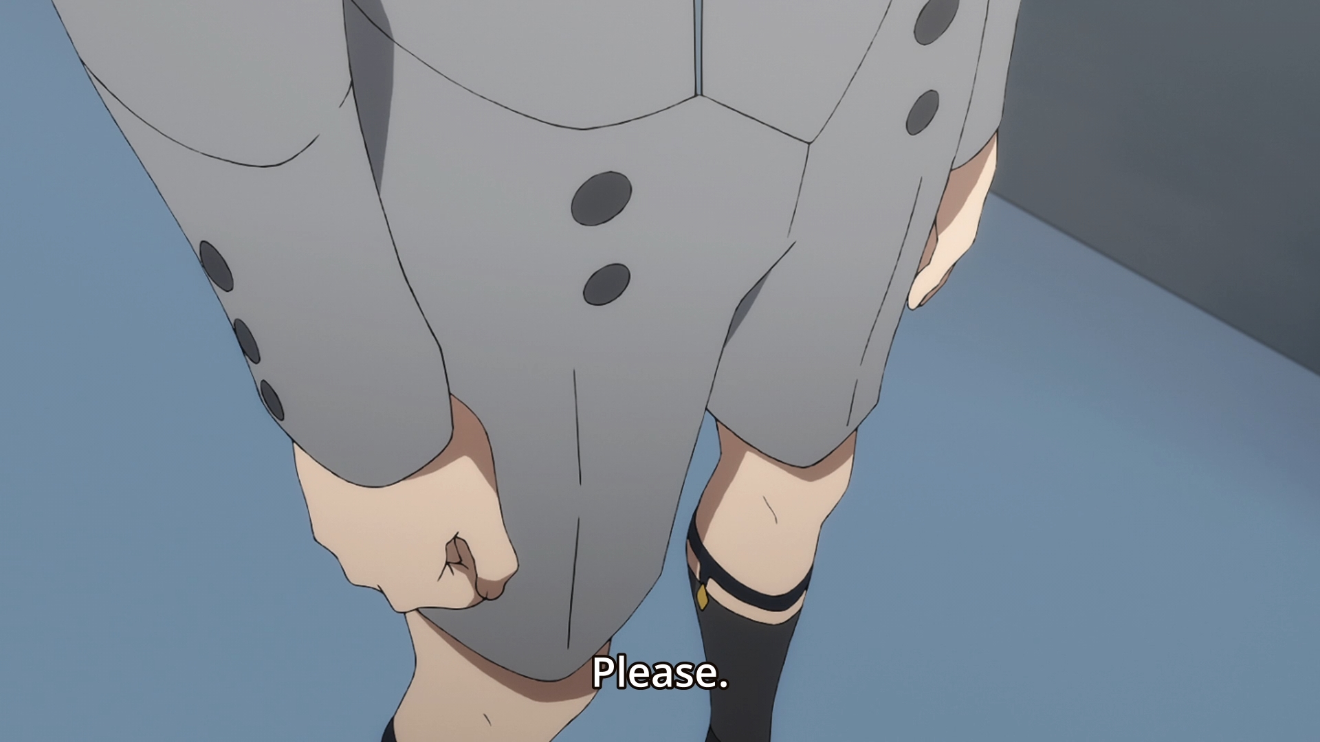 — Zero-Two: “Just look at this lifeless city. There are no skies or oceans here. It’s isolated on a one-way street to nowhere, a dead end of life.” Her words make me wonder if this society can even reproduce sexually. Do they even understand what sex is? After all, the entire setup in the FranXX looks ridiculous. It’s like if you told a robot what sex is like between humans. I can’t help but wonder if this society has stopped having sex, and as a result, it can’t evolve. It just has weird ideas of what sex is supposed to look like, but no one even knows what it means to kiss besides Zero-Two.