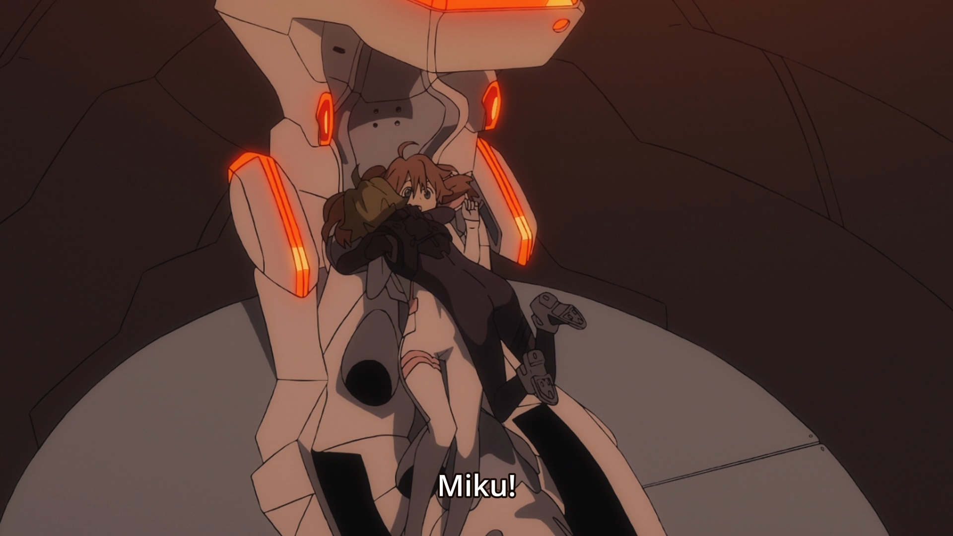 The harsh reality is that the loss of six parasites is just not that big of a deal. There’s more where they came from. It’s more important to the adults that Hiro doesn’t pilot the Strelizia than it is to rescue the other kids. In the end, however, Mitsuru volunteers to become Zero-Two’s latest victim. He thinks he can do it. He thinks he’s just as good if not better than Hiro. Like Zorome, these guys all seem to have a bone to pick with the main character. Is it because he assumed leadership of the group when they were younger? Is it because everyone thought he was so important back at the orphanage? Well, now that Hiro’s a pathetic loser who can’t even become a parasite, every guy — minus Goro for now — wants to upstage him. Zero-Two doesn’t remote care about Mitsuru, though; she’s loyal to her Darling. But faced with the reality of his friends likely dying if Strelizia doesn’t sortie, Hiro can do nothing but clench his fists and give his girl up to someone else. It’s as if the writers behind this show decided that previous mecha anime didn’t have enough NTR, so let’s go whole hog on this one.