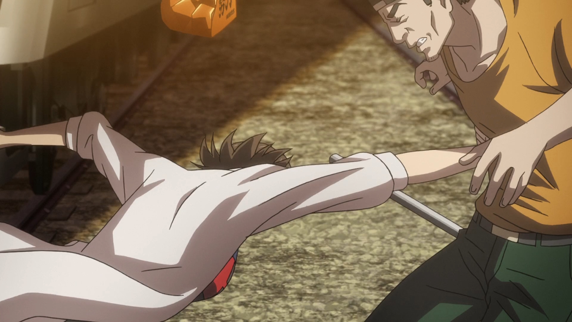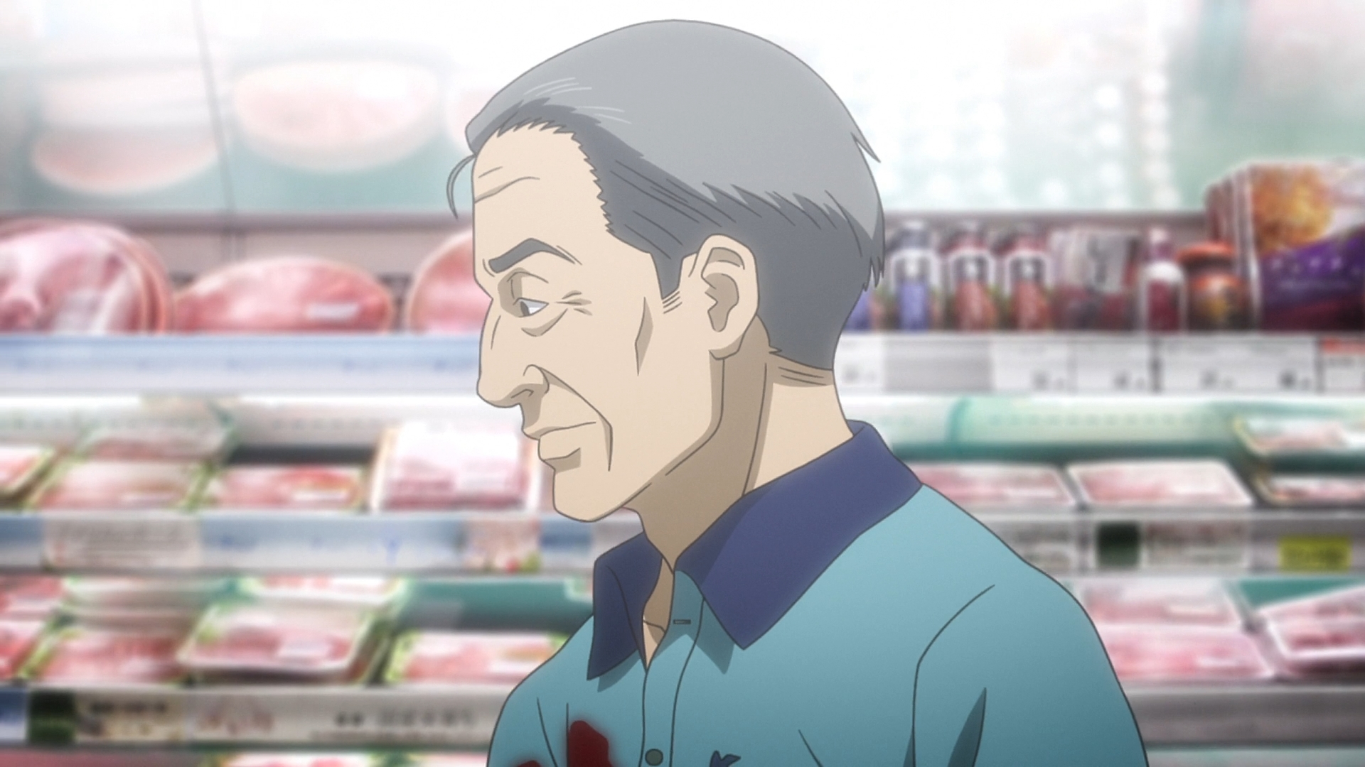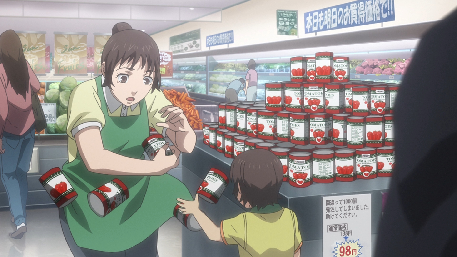 The rest of the episode is sadly a bore. We see a guy attempting to wipe the blood off of his clothes in a supermarket. He suddenly notices a woman trying to steal meat, so he calls her a lowlife. But then he sees her large breasts, and starts to move towards her with a creepy look on his face. What a lowlife. And no, the Herald does not show up. We’re told that the Herald protects the Stalled from being attacked, but sexual assault doesn’t count because…? Luckily for the woman — even if she is a thief, she doesn’t deserve this — Makoto’s voice rings out and prevents the man from going any further. There’s a cute moment in which Makoto runs up to his mother. She’s frozen in time like most people, and it looks like she is in the middle of dropping some cans. Her kid decides to help her out and put the cans back onto the display. Sadly, she can’t respond to him. Tsubasa convinces the kid that they should both head home for now, which the gropey man hears about.
