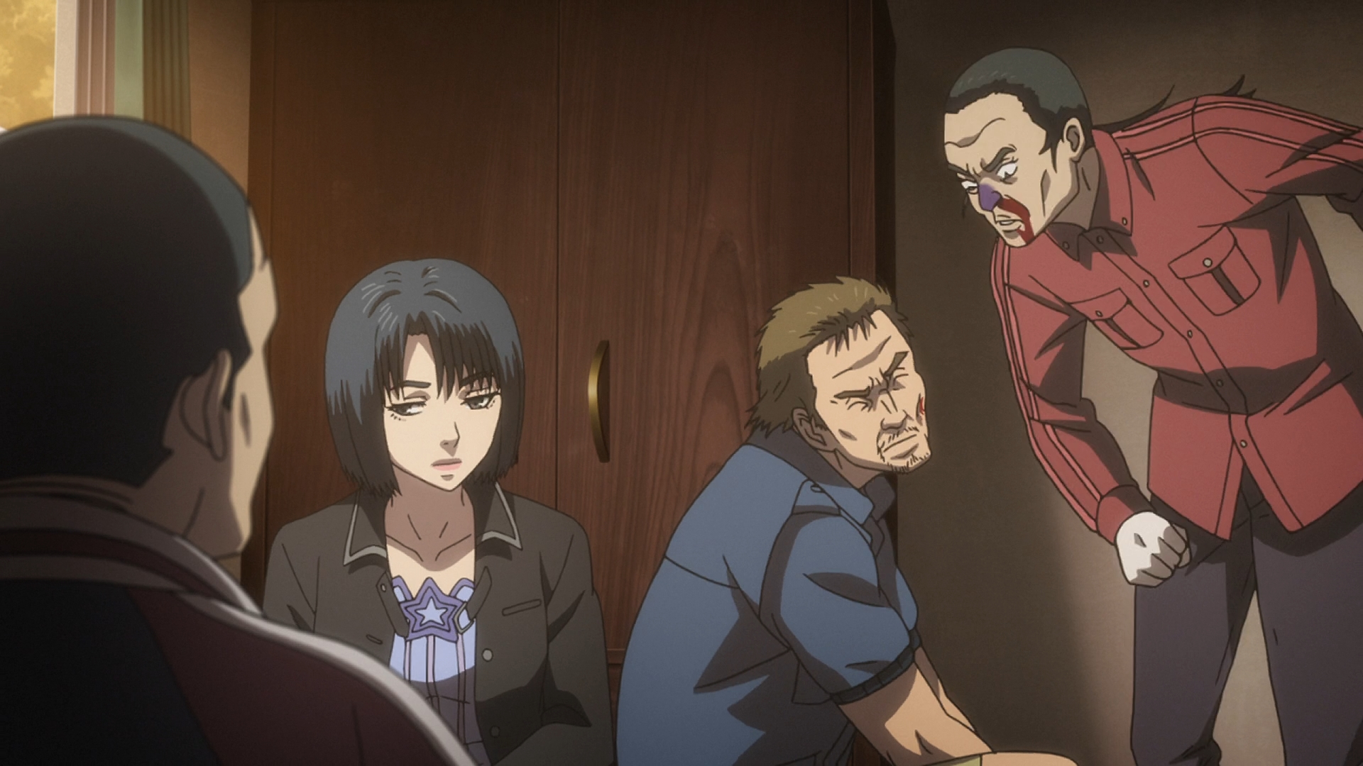 Elsewhere, Sagawa and his partner continues to grill Takafumi, the pathetic wannabe patriarch of the Yukawa family. All we really learn is that Takafumi is as ineffectual as he looks. There’s a good chance they can manipulate him if they take advantage of his insecurities as an out-of-work father who can’t protect his own family. Moreover, the fact that he doesn’t know a damn thing about the family stone or Stasis shows that his own father didn’t believe in him. I wouldn’t be surprised if Takafumi ends up screwing his family out of spite or resentment.