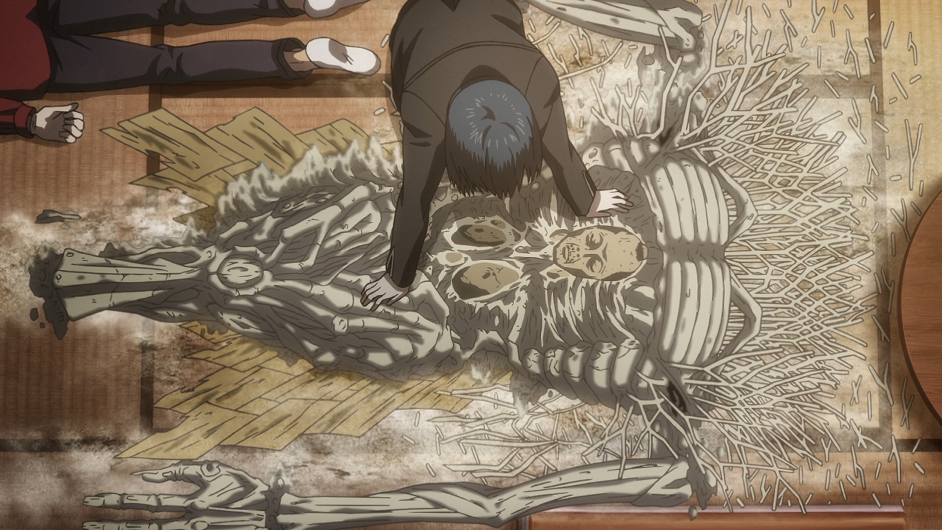 Majima digs into the body to reveal a desiccated head attached to… lumps of flesh? Dirt? Stone? I don’t know… we get some exposition about how people who give their lives up to the world of Stasis can join the Specters and become one of the Heralds. Also, a member of her own family had become one of these Heralds, and this is probably why she even joined up with Sagawa’s cult in the first place. She’s looking for her lost family member. This part is at least somewhat interesting, but then the episode comes to an end. Next week’s previews suggest that we’ll finally learn what happened between Juri and Majima, but the story’s been so slow, all my excitement and anticipation have pretty much petered out. After four weeks — a month’s worth of episodes — I’m still not emotionally invested in any of the characters, and the world of Stasis isn’t mysterious enough to carry the show by itself.