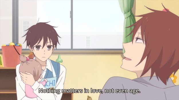 We get two rather inconsequential stories in this week’s episode. First up, Inui, a second year student, shows up looking for the baby. He claims that Midori is his future daughter, so he may as well start getting to know her. Considering how he can’t even handle a little baby poop, however, he’s way out of his depth. Plus, he’s going after his own teacher?