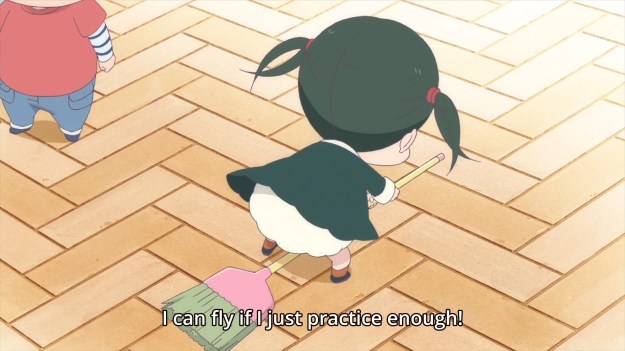 So all’s well that ends well. Like I said, this episode is largely inconsequential. We got two silly, childish fantasies. One got crushed, and the other lives on to be crushed later. Nah, I’m just kidding about the last part. Witches are cool. I kinda wanna rewatch Little Witch Academia now. Anyways, to wrap this post up, there is hardly any character development or plot progression in this week’s episode. Gakuen Babysitters continues to be babysitting and childcare without any of the interesting human drama.