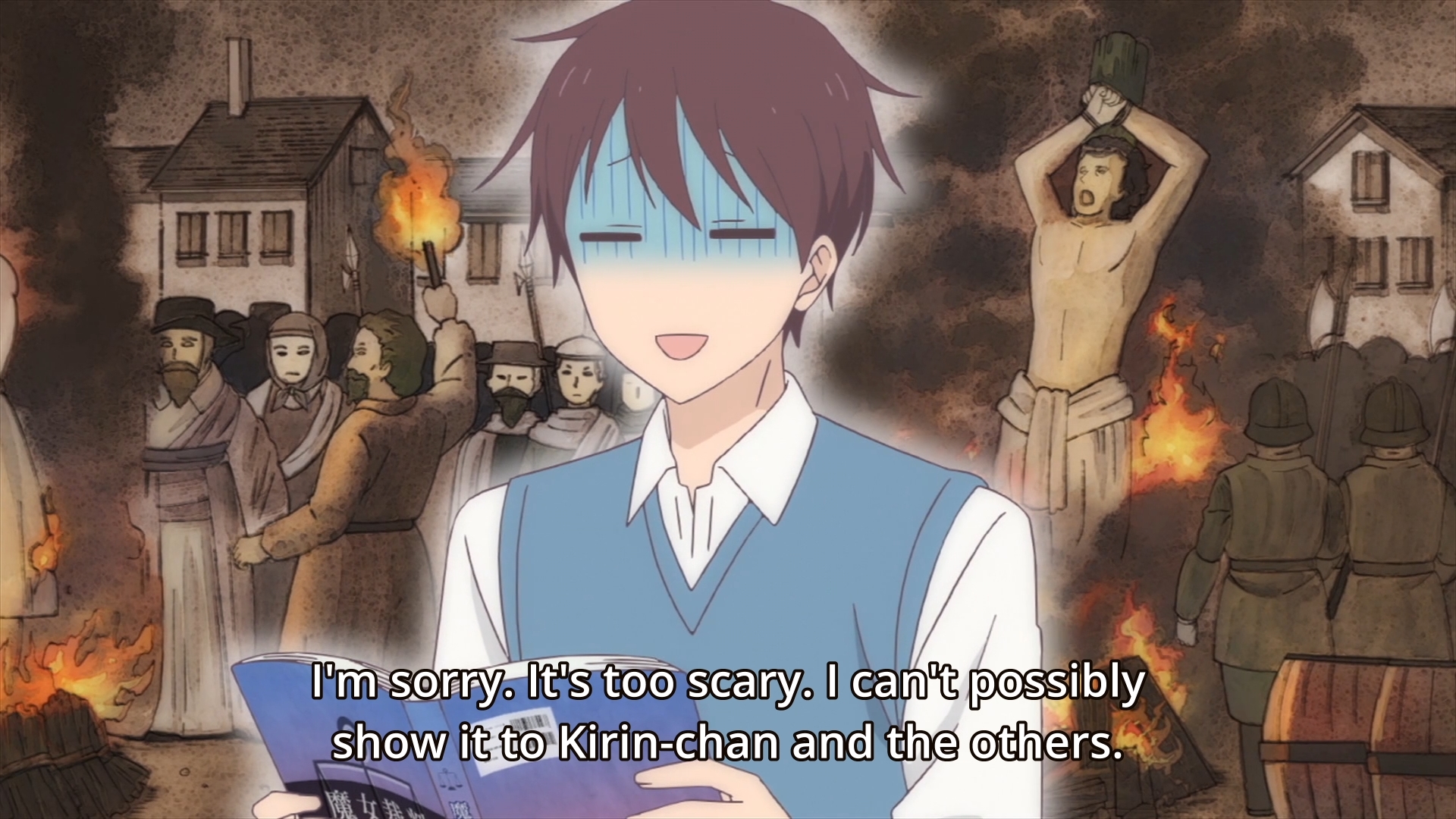 Maria suggests turning to history to convince Kirin that witches are real, but Ryuichi is afraid that this might scare the kids. Hey, you never know… the little girl might find the occult cool and awesome. I know I would’ve. I loved reading ghost stories as a kid. Anyways, I honestly thought Ryuichi would try to convince Maria to dress up like a witch just to play pretend with Kirin. He even considers asking the chairwoman to help out, but he quickly moves on from the idea because she’d (likely) just yell at him.